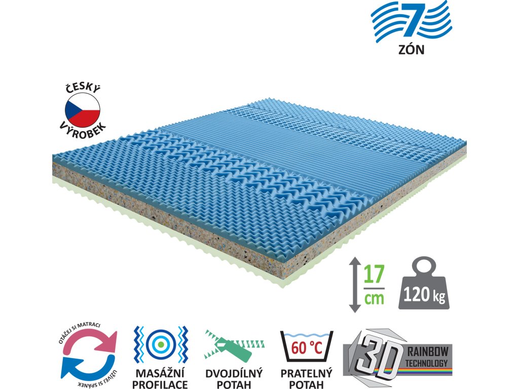 3D Rainbow technologie – speciální profilace na sendvičové vrstvě z kombinace Flexifoam pěn různých vlastností a tuhostí, která zajišťuje komfort, vzdušnost, ortopedické vlastnosti a dlouhou životnost anatomická zónová masážní profilace – 7 zón na obou stranách, jemná masáž v průběhu spánku rozdílná tuhost stran – zelenkavá měkčí strana tuhost 2 z 5, modrá tužší strana tuhost 2,5 z 5 vzdušný potah prošitý dutým vláknem, vyrobený ze 2 částí, snímatelný a pratelný do 60 °C doporučená nosnost do 120 kg, výška matrace 17 cm
