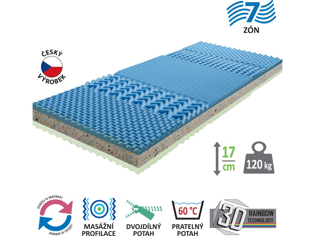 3D Rainbow technologie – speciální profilace na sendvičové vrstvě z kombinace Flexifoam pěn různých vlastností a tuhostí, která zajišťuje komfort, vzdušnost, ortopedické vlastnosti a dlouhou životnost anatomická zónová masážní profilace – 7 zón na obou stranách, jemná masáž v průběhu spánku rozdílná tuhost stran – zelenkavá měkčí strana tuhost 2 z 5, modrá tužší strana tuhost 2,5 z 5 vzdušný potah prošitý dutým vláknem, vyrobený ze 2 částí, snímatelný a pratelný do 60 °C doporučená nosnost do 120 kg, výška matrace 17 cm