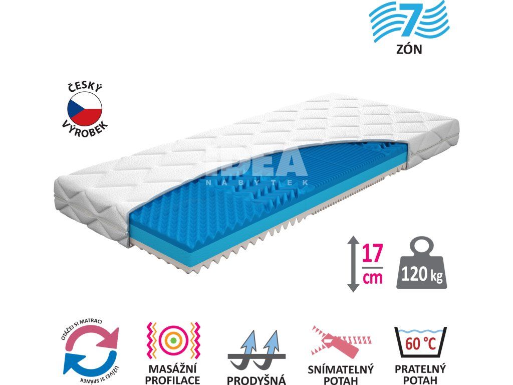 oboustranná partnerská sendvičová matrace z velmi kvalitních polyuretanových pěn s vyšší objemovou hmotností obě strany – 7zónová anatomická profilace, která umožňuje provzdušnění lůžka a napomáhá uvolnění svalstva rozdílná tuhost stran (2 z 5 / 4 z 5) doporučené uložení na pevný i polohovací lamelový rošt potah snímatelný a pratelný do 60 °C doporučená nosnost do 120 kg, výška matrace 17 cm, výška jádra 16 cm