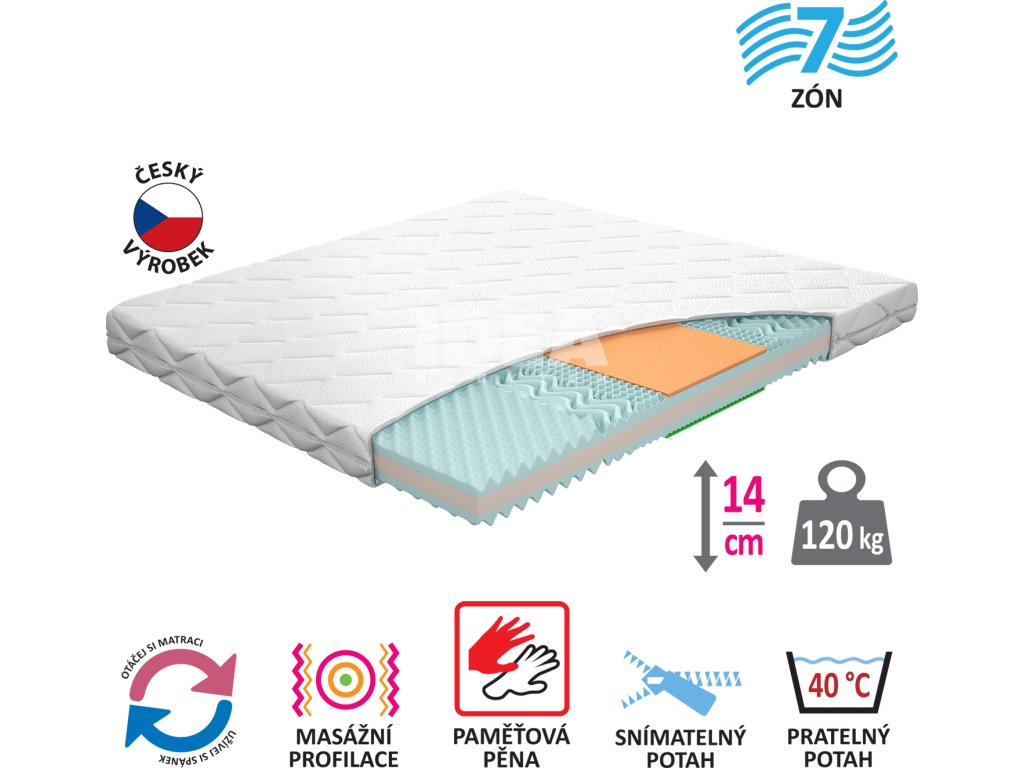 paměťová pěna různých tuhostí v pánevních zónách přináší odlehčení kloubům a celému pohybovému aparátu 7zónová anatomická masážní profilace – velice jemná masáž v průběhu spánku matrace s Visco systémem rozdílné tuhosti stran vhodná pro všechny typy roštů potah snímatelný a pratelný do 40 °Cdoporučená nostnost do120 kg