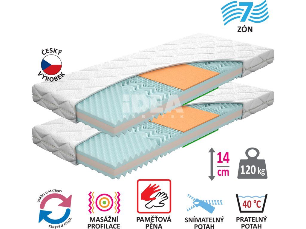dvě matrace za cenu jedné paměťová pěna různých tuhostí v pánevních zónách pro odlehčení kloubům a celému pohybovému aparátu 7zónová anatomická masážní profilace přináší velmi jemnou masáž v průběhu spánku matrace s Visco pěnou a systémem rozdílné tuhosti stran vhodná pro všechny typy roštů potah snímatelný a pratelný do 40 °C doporučená nostnost do 120 kg