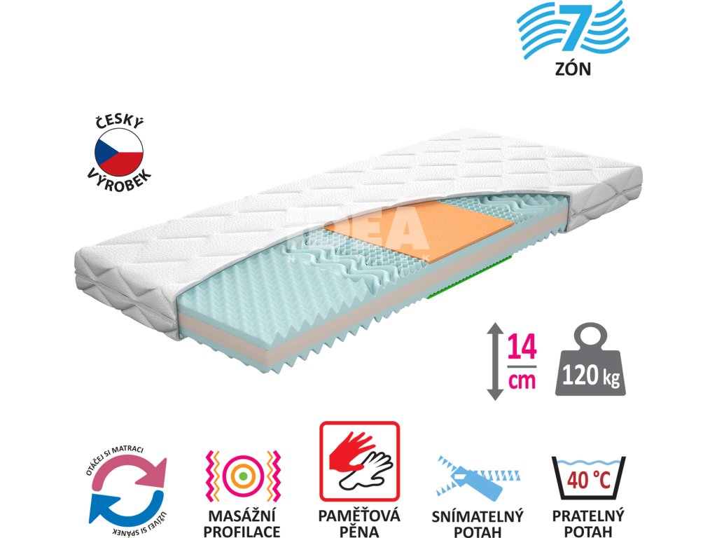 paměťová pěna různých tuhostí v pánevních zónách pro odlehčení kloubům a celému pohybovému aparátu 7zónová anatomická masážní profilace přináší velmi jemnou masáž v průběhu spánku matrace s Visco pěnou a systémem rozdílné tuhosti stran vhodná pro všechny typy roštů potah snímatelný a pratelný do 40 °C doporučená nostnost do 120 kg