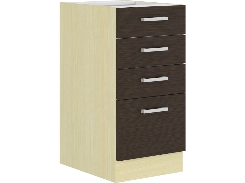 Dolní skříňka se 4 zásuvkami CHAMONIX II vyrobená z kvalitního lamina. Korpus i sokl ( 10 cm ) jsou v barvě dub ferrara a dvířka v barvě dub tmavé legno. Rozměry skříňky - šířka 40 cm, výška 82 cm, hloubka 52 cm ( s pracovní deskou zabere 60 cm ). Vzadu se nechává volný prostor. Pracovní deska není v ceně. Úchyty jsou z plastu. V naší nabídce naleznete další výběr skříněk k sestavení celé kuchyně.Doplňkové parametry