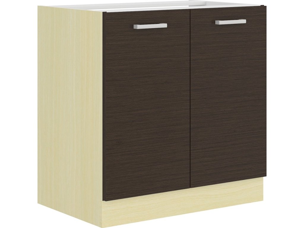 Dolní skříňka dvoudveřová pod dřez CHAMONIX II vyrobená z kvalitního lamina. Korpus i sokl ( 10 cm ) jsou v barvě dub ferrara a dvířka v barvě dub tmavé legno. Rozměry skříňky - šířka 80 cm, výška 82 cm, hloubka 52 cm. Skříňka nemá zadní desku kvůli odpadním trubkám. Skříňka neobsahuje pracovní desku, což je vhodné při koupi celoplošného dřezu. Při koupi vestavného dřezu je třeba pracovní desku doobjednat. Úchyty jsou z plastu. V naší nabídce naleznete další výběr skříněk k sestavení celé kuchyně.Doplňkové parametry