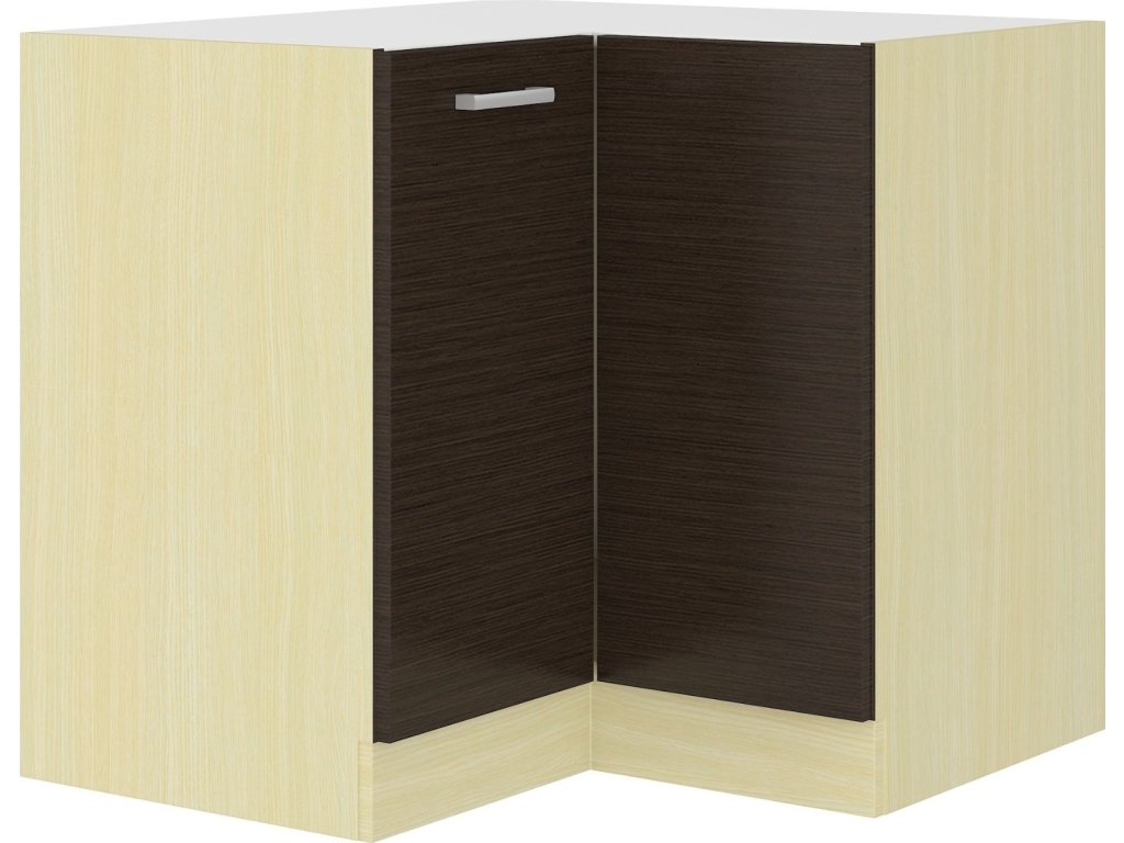 Dolní skříňka rohová CHAMONIX II vyrobená z kvalitního lamina. Korpus i sokl ( 10 cm ) jsou v barvě dub ferrara a dvířka v barvě dub tmavé legno. Rozměry skříňky - šířka 89 x 89 cm, výška 82 cm, hloubka 52 cm. Pracovní deska není v ceně. Úchyty jsou z plastu. Dvířka mají pravé otvírání. V naší nabídce naleznete další výběr skříněk k sestavení celé kuchyně.Doplňkové parametry