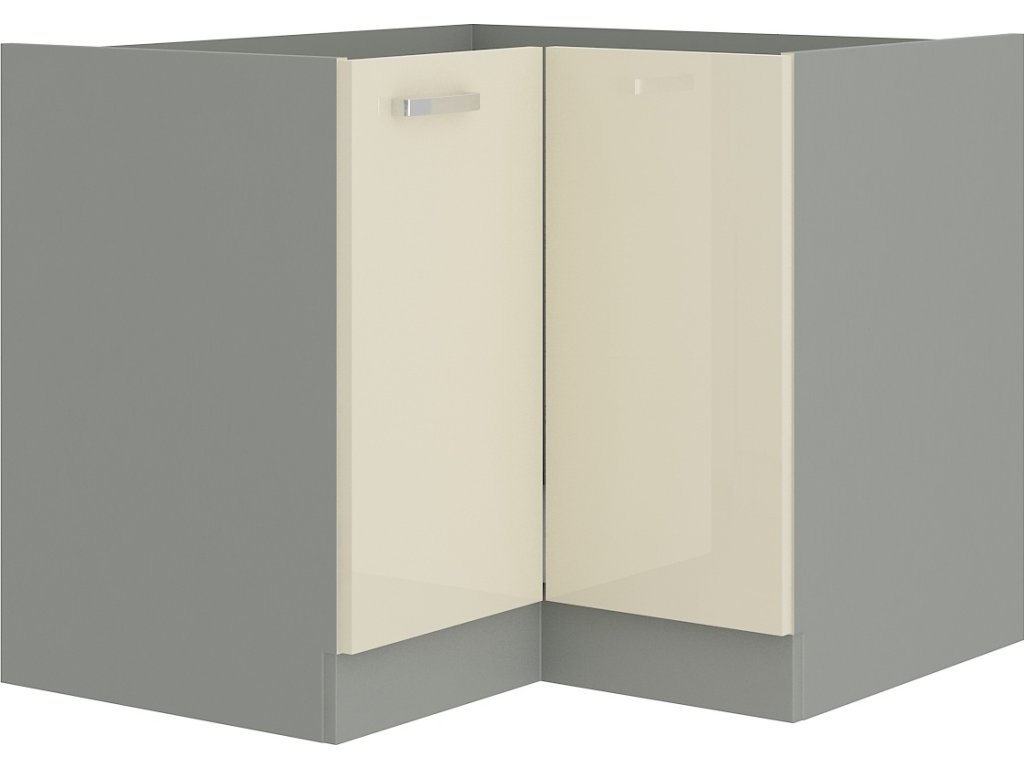 Dolní skříňka rohová KARMEN vyrobená z kvalitního lamina a MDF. Korpus i sokl ( 10 cm ) jsou v barvě šedá a dvířka v barvě karmen krémová v lesku. Rozměry skříňky - šířka 83 x 83 cm, výška 82 cm, hloubka 52 cm. Pracovní deska není v ceně. Úchyty jsou z kovu. Dvířka mají pravé otvírání. V naší nabídce naleznete další výběr skříněk k sestavení celé kuchyně.Doplňkové parametry