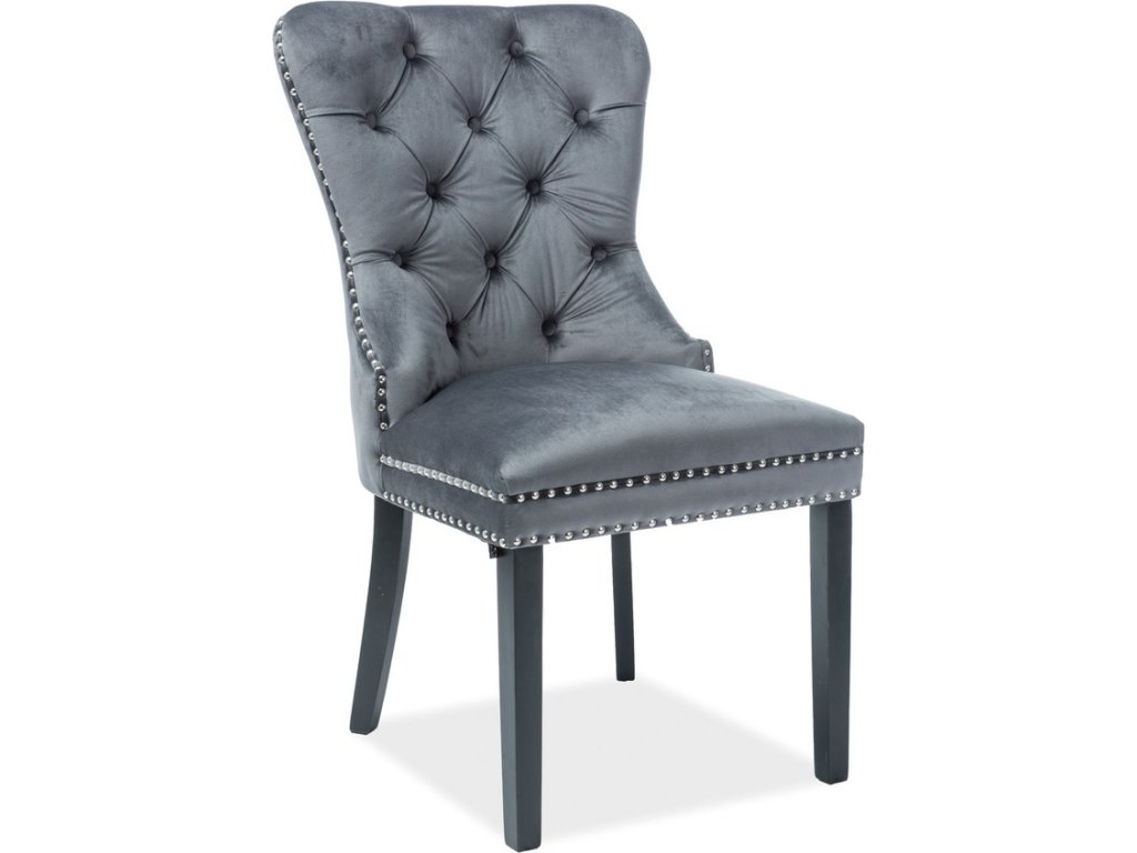 Atraktivní, velice pohodlná čalouněná židle - křeslo v novodobém stylu modern glamour. Nohy jsou ze dřeva v černé barvě, čalounění sedáku je vyrobeno z potahové látky Bluvel aksamit v šedé barvě. Kovové zdobení po obvodu a na zádech židle dodá ještě větší nádech luxusu. Dodáváme v demontovaném stavu.Doplňkové parametry