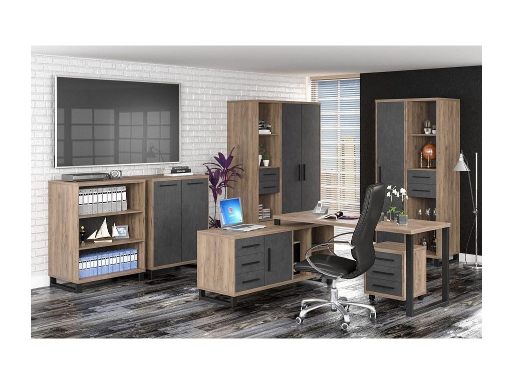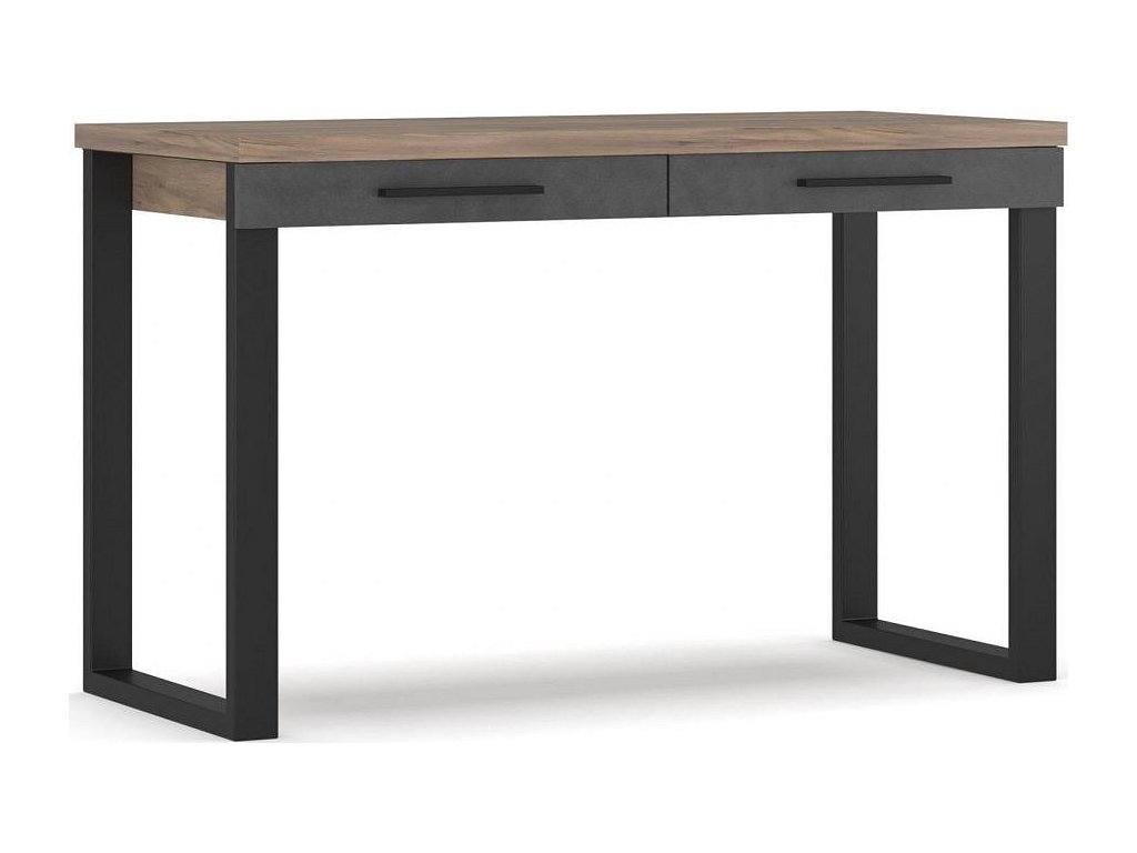 Psací stůl se dvěma zásuvkami v industriálním stylu je vyroben z kvalitní LTD v barevném provedení dub tabaco/matera. Pevné kovové nohy podtrhují loftový ráz nábytku. Úchyty jsou kovové. V naší nabídce najdete široký výběr komponentů této kolekce, které si můžete dokoupit. Dodáváme v demontovaném stavu.Doplňkové parametry
