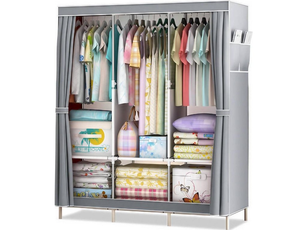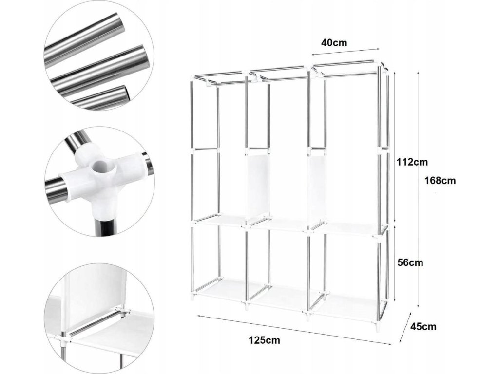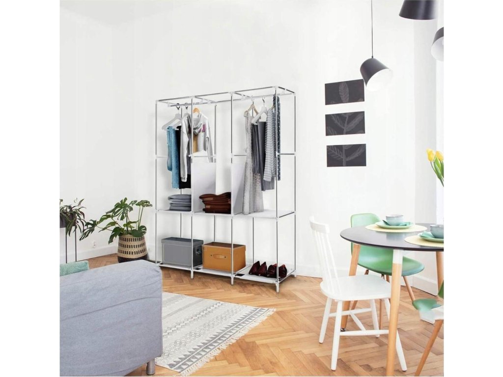 Látková skříň je ideální jako dočasná skříň pro studenty do studentských pokojů nebo internátů. Můžete ji také využít jako další úložný prostor ve vaší domácnosti, který vám pomůže efektivně využít prostor. Je vyrobena z pevných kovových trubek, kvalitních netkaných textilií a plastových spojek, které poskytují prostorný úložný prostor a vysokou nosnost pro dlouhodobé a všestranné skladování. Skládá se z horní a dolní části; horní část má 3 tyče na zavěšení dlouhých outfitů, kabátů a svetrů, zatímco spodní část obsahuje 3 police. Úložný prostor je doplněn bočními kapsami. Vysoce kvalitní konstrukční trubky zajišťují nosnost až 60 kg (je však nutné skříň rovnoměrně zatížit). Přenosná skříň je dodávána s jasnými a srozumitelnými pokyny pro montáž, takže ji snadno sestavíte během několika minut bez použití nářadí. Poskytuje skvělou ochranu pro vaše oblečení, je vybavena T-zipem a suchým zipem, prachotěsným a voděodolným potahem, který lze snadno čistit vlhkým hadříkem. Dodává se v demontovaném stavu.