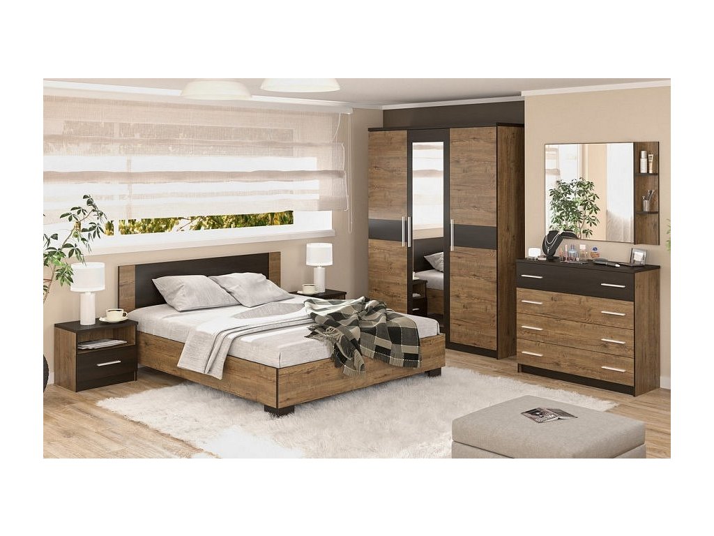 Sestava do ložnice ze sektorového nábytku v moderním provedení v kontrastních barvách dokonale doplní Váš interiér. Nábytek je vyroben z kvalitní LTD desky v barevné kombinaci dub april/wenge. (Výrobce nezaručuje horizontální či vertikální provedení barvy dubu april). Nabídka komponentů této sektorové řady umožňuje sestavit si nábytek do ložnice nebo studentského pokoje dle vlastních představ. Sestava se skládá z (š/v/hl): - postele (166,4 x 85,2 x 203,6 cm), - 2 kusy nočního stolku (50,2 x 45,6 x 37,2 cm ), - komody se 4 zásuvkami (102,8 x 91,2 x 40 cm) a - šatní skříně třídveřové se zrcadlem (156 x 203,4 x 56,3 cm). V ceně není zahrnuta matrace a rošt, obojí je možno dokoupit, vhodný rozměr 160 x 200 cm nebo 2 ks 80 x 200 cm. Dodáváme v demontovaném stavu.
