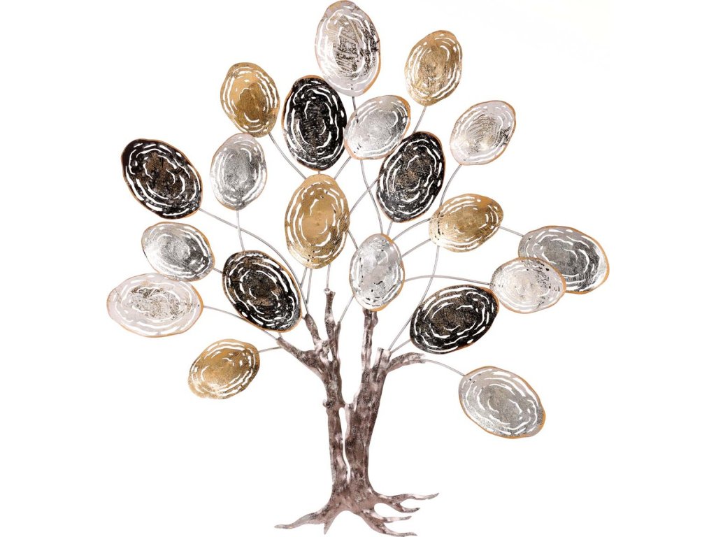 Nástěnná kovová dekorace ve tvaru stromu s lístky v odstínech stříbrné, černé a zlaté barvy.Doplňkové parametry