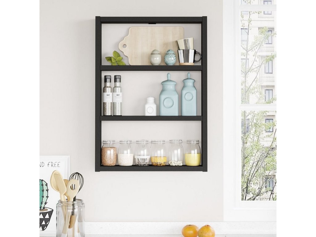Nástěnná police v elegantní černé barvě dodává vašemu interiéru moderní šmrnc. Je ideálním řešením pro uchovávání knih, dekorací nebo kuchyňských potřeb, a to vše s důrazem na styl.