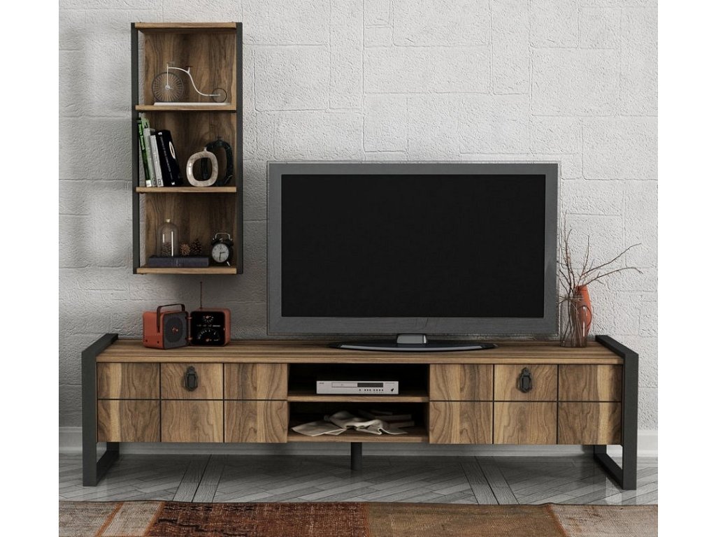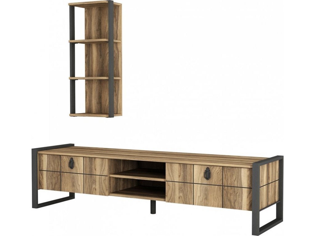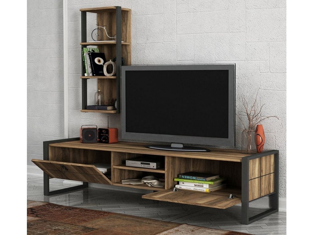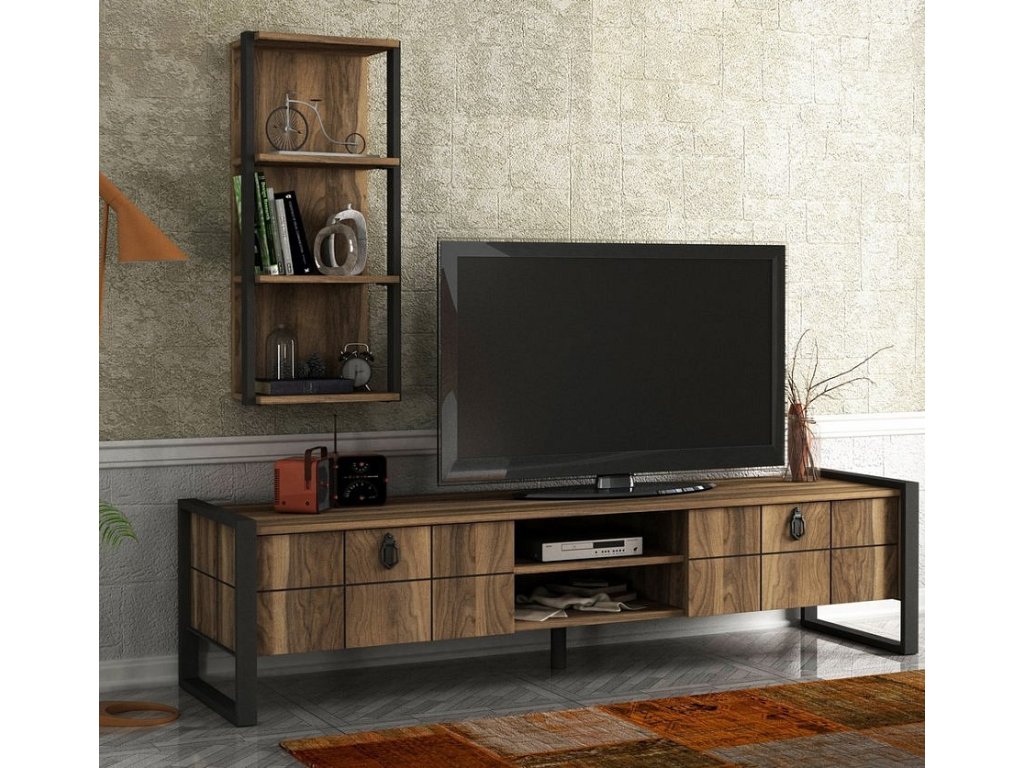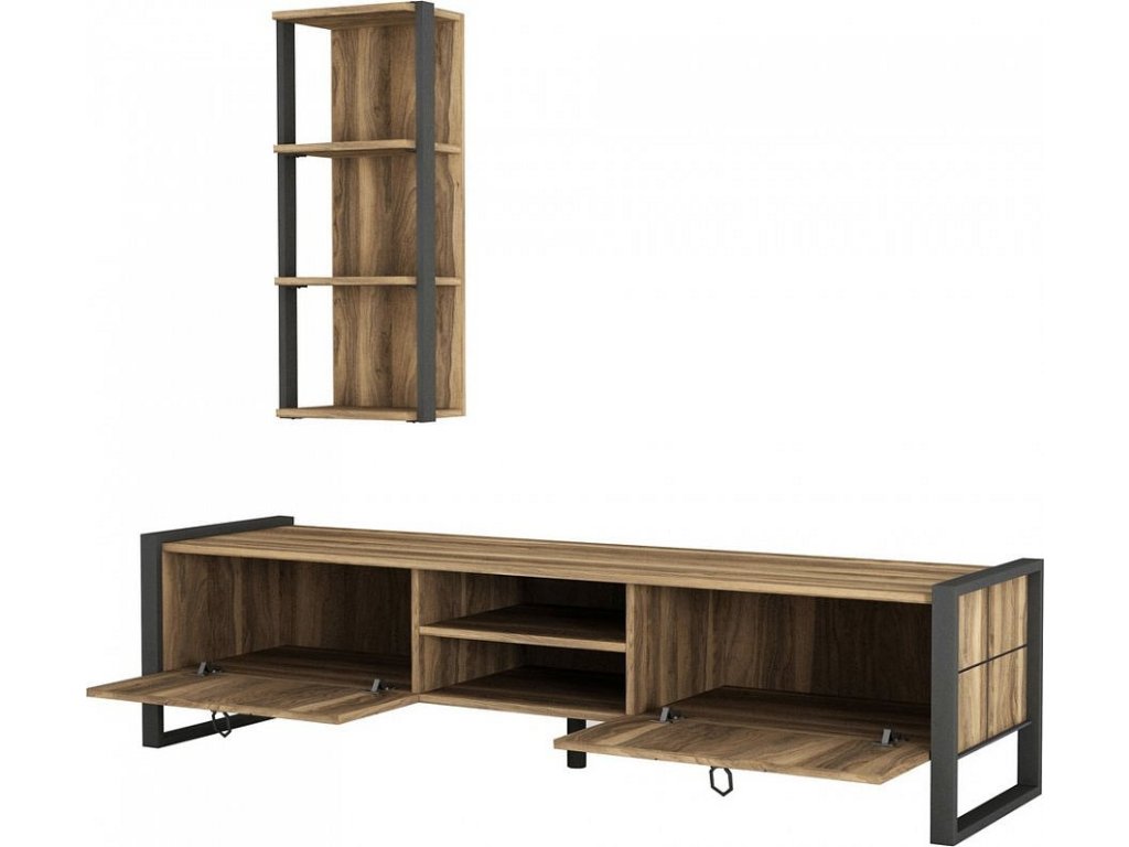 Televizní stolek se dvěma výklopnými dvířky je vyroben z kvalitního lamina o tl.18 mm hraněné PVC páskou, odolného proti poškrábání v barvě vlašský ořech. Stolek je vsazen do kovových rámů, které slouží jako nohy stolu. Součástí balení je také závěsný regál o rozměrech (Š x V x H cm) 34 x 80 x 21,3 cm. Dodáváme v demontovaném stavu.Doplňkové parametry