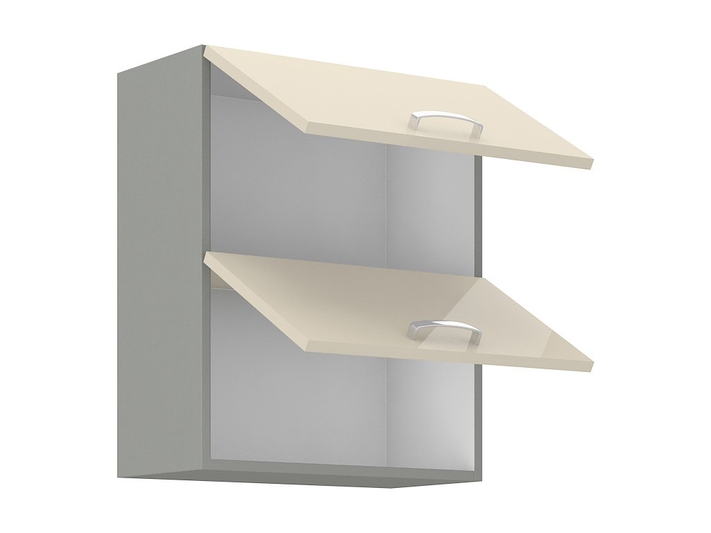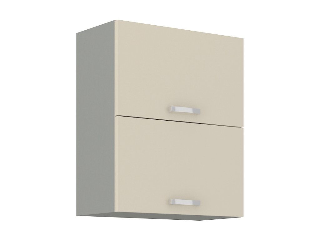 Horní výklopná skříňka dvojitá KARMEN vyrobená z kvalitního lamina a MDF. Korpus je v barvě šedá a dvířka v barvě karmen krémová v lesku. Rozměry skříňky - šířka 60 cm, výška 71,5 cm, hloubka 31 cm. Úchyty jsou z kovu. Dvířka jsou pomocí plynových pístů otvíraná nahoru. V naší nabídce naleznete další výběr skříněk k sestavení celé kuchyně.Doplňkové parametry