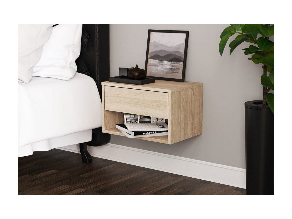 noční stolek je vyroben v minimalistickém designu a představuje praktické řešení odkládacího prostoru pro malé ložnice. noční stolek s čistými liniemi dodá vaší ložnici funkčnost a vzdušný vzhled. Jednoduše jej připevněte na stěnu vedle postele do vámi preferované výšky a nechte, aby se postaral o nezbytnosti, které chcete mít během večera či časného rána u sebe. Stolek obsahuje kromě odkládací police i zásuvku s bezúchytovým otevíráním pro snadný přístup k uloženým předmětům.