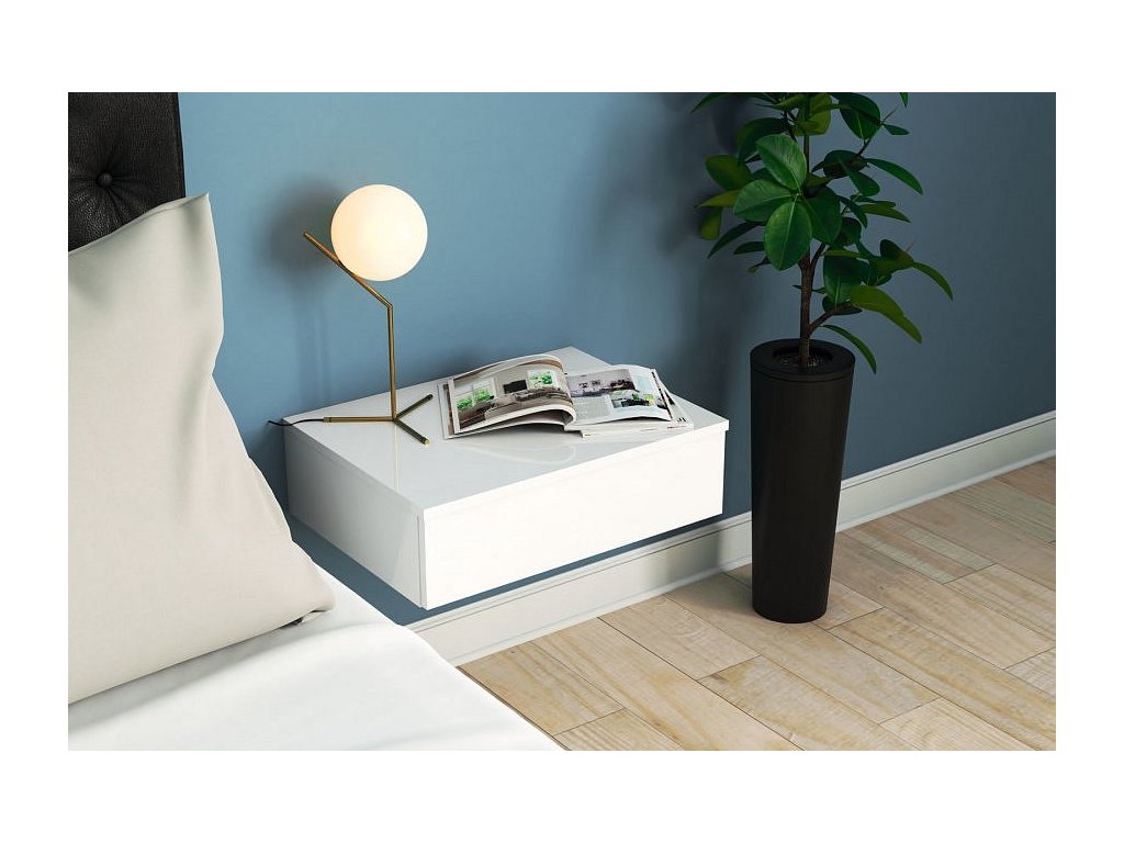 noční stolek je vyroben v minimalistickém designu a představuje praktické řešení odkládacího prostoru pro malé ložnice. noční stolek s čistými liniemi dodá vaší ložnici funkčnost a vzdušný vzhled. Jednoduše jej připevněte na stěnu vedle postele do vámi preferované výšky a nechte, aby se postaral o nezbytnosti, které chcete mít během večera či časného rána u sebe. Stolek obsahuje zásuvku s bezúchytovým otevíráním pro snadný přístup k uloženým předmětům.