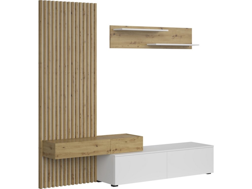 Obývací stěna se bude hodit zejména do obývacího pokoje zařízeného do moderního či skandinávského stylu. Prezentovaná nábytková sestava je kombinací estetického designu a funkčnosti. Stylový lamelový panel bude ozdobou každého interiéru a skvěle doplňuje stěnu s TV stolkem a policí. LTD o tloušťce 16 mm a 22 mm, zadní část nábytku je vyrobena z dřevovláknité desky o tloušťce 3 mm, panty Hettich, HAFELE celovýsuvná kuličková vedení, plastové nohy, bezúchytový systém "PUSH TO OPEN". Barevné provedení - bílá mat/dub Artisan. Dodáváme v demontovaném stavu.Doplňkové parametry