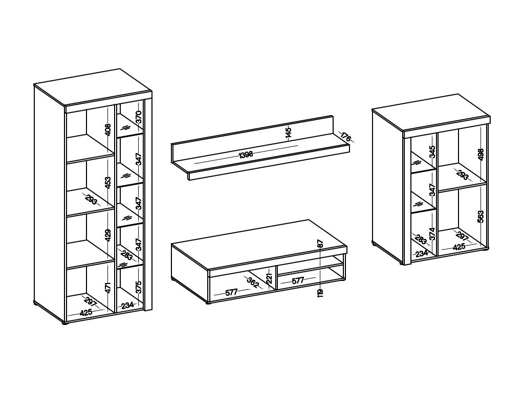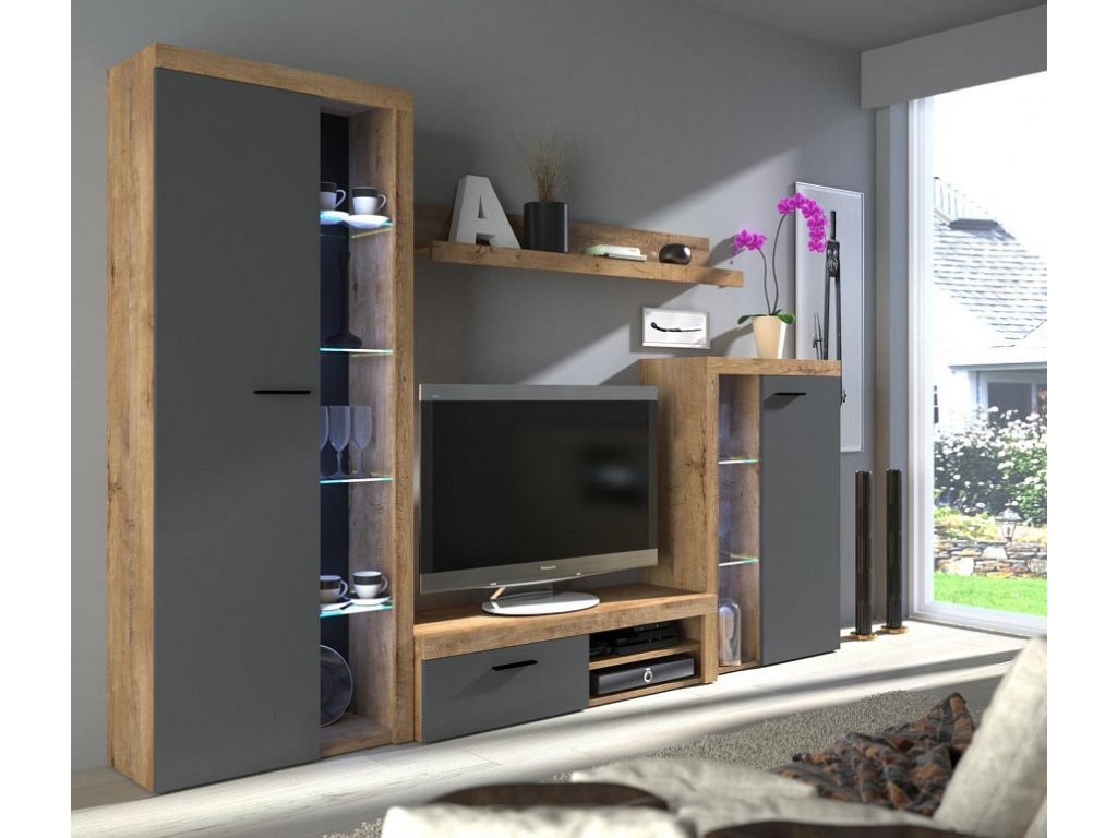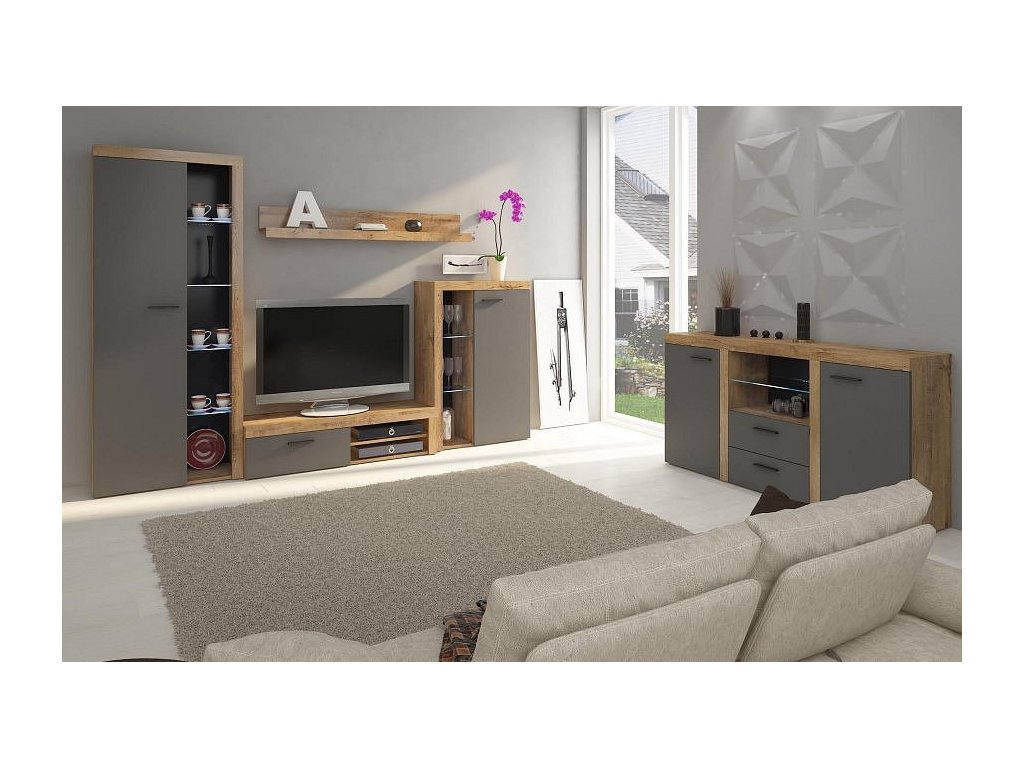 Moderní obývací stěna, která si zakládá na nejnovějších trendech bydlení. Nábytek je vyroben z kvalitního lamina. Sestava se skládá z ( šířka/hloubka/výška ) - TV stolek ( 120 x 40,3 x 31,5 cm ), vysoká vitrína ( 75 x 33,9 x 190 cm ), nízká vitrína ( 75 x 33,9 x 117 cm ) a police ( 140 x 17,6 x 16 cm ). Korpus je v barvě dub lefkas a dvířka jsou v barvě grafit. Tato stěna se prodává jako sestava, jednotlivé díly nelze koupit zvlášť. Ve vitrínách jsou skleněné police. LED osvětlení není v ceně, možnost dokoupení. Dodáváme v demontovaném stavu.Doplňkové parametry