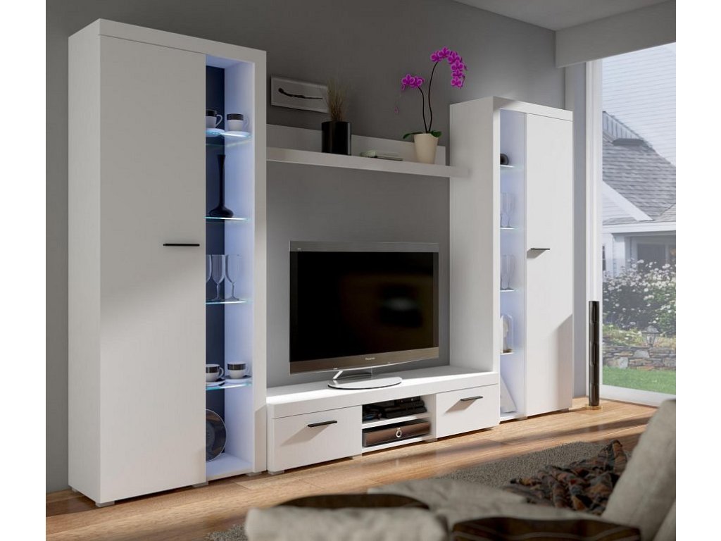 Moderní obývací stěna, která si zakládá na nejnovějších trendech bydlení. Nábytek je vyroben z kvalitního lamina. Sestava se skládá z ( šířka/hloubka/výška ) - TV stolek ( 150 x 40,2 x 31,5 cm ), 2x vysoká vitrína ( 75 x 33,8 x 190 cm ) a police ( 140 x 17,6 x 16 cm ). Dvířka i korpus jsou v barvě matná bílá. Tato stěna se prodává jako sestava, jednotlivé díly nelze koupit zvlášť. Ve vitrínách jsou skleněné police. LED osvětlení není v ceně, možnost dokoupení. Dodáváme v demontovaném stavu.Doplňkové parametry