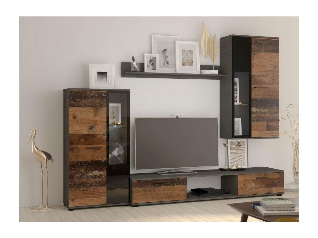 Moderní obývací stěna. Nábytek je vyroben z kvalitního lamina. Sestava se skládá z vitríny 59 x 31 x 115, TV stolku 176 x 40 x 28, závěsné vitríny 59 x 31 x 113 a police 102 x 18 x 16 cm. Korpus je v barvě dub old style, dvířka v barvě matera (černošedá). Sklo ve vitríně je čiré. Tato stěna se prodává jako sestava, jednotlivé díly nelze koupit zvlášť. Možnost doobjednání komody nebo LED osvětlení. Dodáváme v demontovaném stavu.Doplňkové parametry