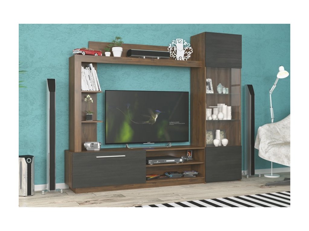 Moderní obývací stěna, která si zakládá na nejnovějších trendech bydlení. Nábytek je vyroben z kvalitní LTD. Korpus je v barvě nothern tree, dvířka jsou v barvě ořech. Tato stěna se prodává jako sestava. Ve vitríně jsou skleněné police. Prostor pro televizi je - výška 94,6 cm, šířka 120,7 cm. Dodáváme v demontovaném stavu.Doplňkové parametry