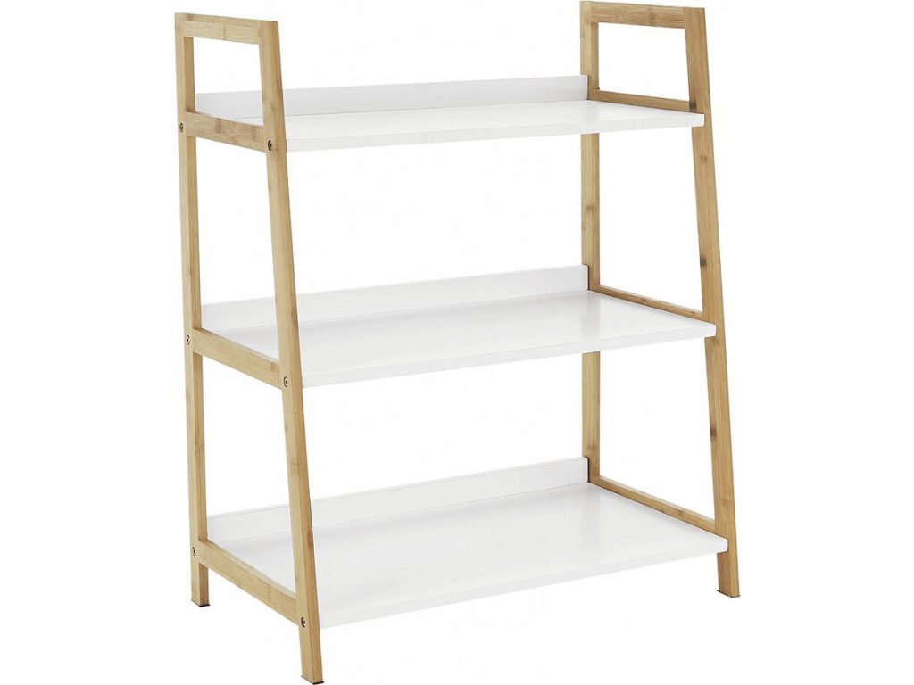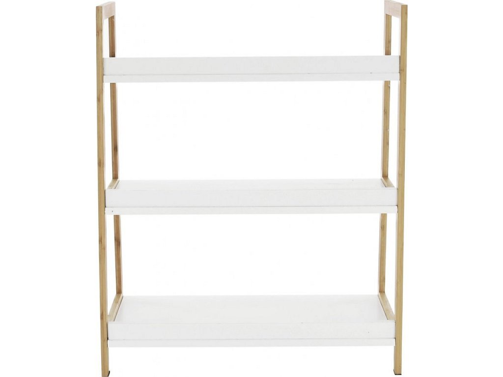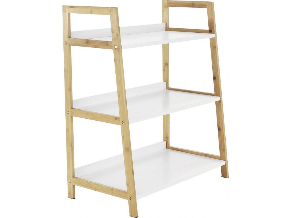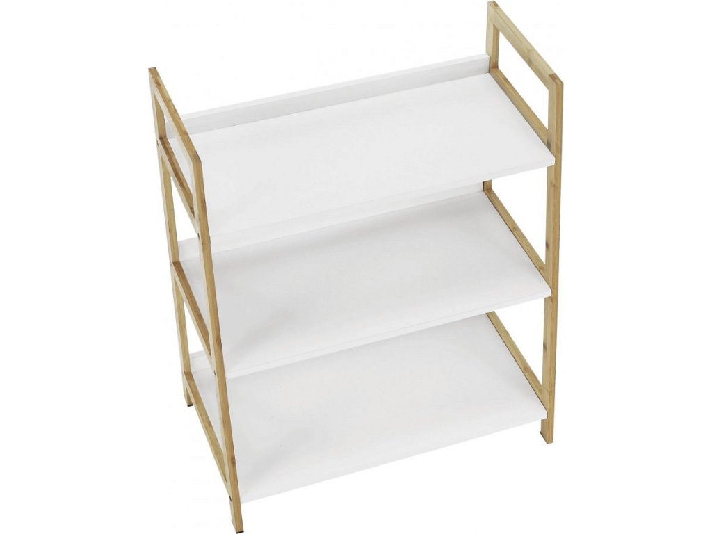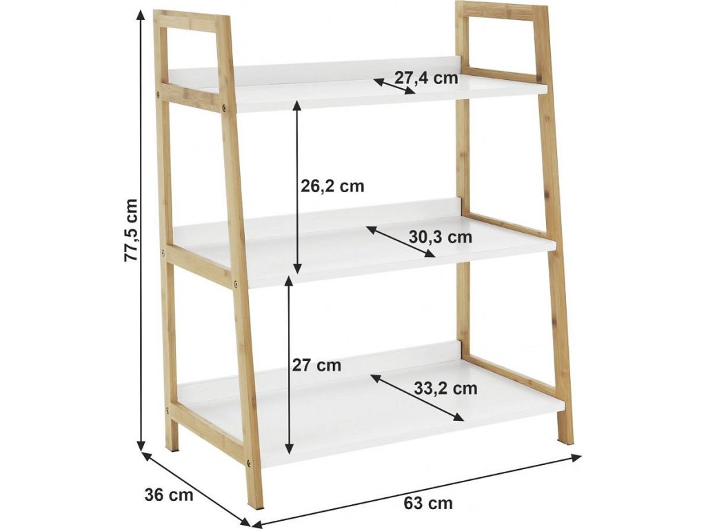Víceúčelový regál Koen TYP 1 Materiál: MDF / bambus lakovaný Barva: bílá / přírodní Rozměry (ŠxHxV): 63x36x77,5 cm Tloušťka materiálu stojan: 1,4 cm Tloušťka materiálu police: 1,6 cm Nosnost na jednu polici: 5 kg 3 police Hloubka vrchní police: 27,4 cm Hloubka střední police: 30,3 cm Hloubka spodní police: 33,2 cm Prostor mezi vrchní a střední policí: 26,2 cm Prostor mezi střední a spodní policí: 27 cm moderní design praktický Dodávané v demontu.