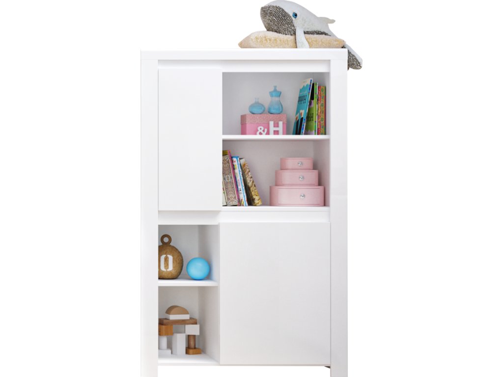Materiál: laminovaná DTD / MDF Barva: bílý lesk Rozměry (ŠxHxV): 98x41,5x156,5 Materiál dvířka: MDF Tloušťka materiálu: 1,6 cm ABS hrany kombinovaný regál Obsahuje otevřené police a dvě skříňky Otevřený i uzavřený úložný prostor bez úchytek Moderní design a atraktivní design Dodávané v demontu