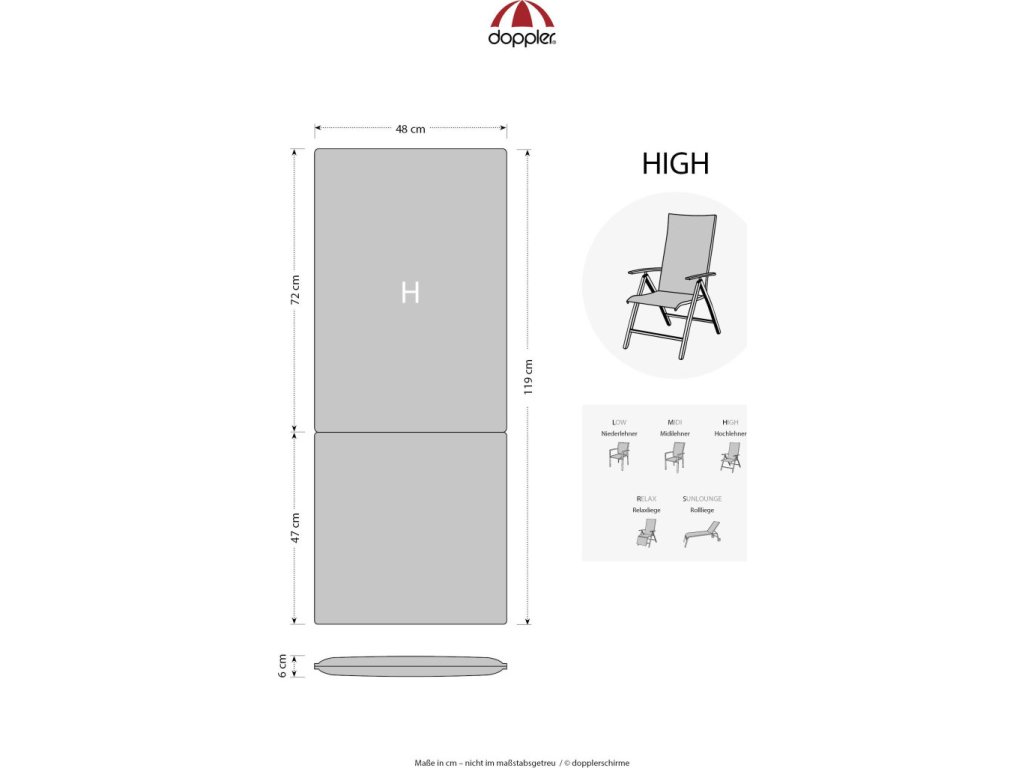 Polstr s vysokou opěrkou na zahradní nábytek řady STAR je v provedení s obšitým lemem, 4x kroužkově prošitý v opěradle. Uchycení je pomocí posuvné spony. Díky sponě si můžete nastavit velikost dle rozměru a druhu židle, spona je pevná a nevytahuje se. Upevnění sedáku je pomocí dvou tkaniček v ohybu polstru. Potah je nesnímatelný.Rozměr: 119x48x6 cm (výška x šířka x tloušťka), sedák 47x48 cm, opěradlo 72x48 cm.Potah: vysoce jakostní dralonová tkanina. Jedná se o setkávaná barevná vlákna.Výplň: molitan, polyesterové rouno.Celkové rozměry podušek jsou uváděny s tolerancí plus /- 2cm, konečný rozměr hotového výrobku vždy ovlivňuje jeho konkrétní zpracování (např. obšití, prošití apod). Dralon: Polyakrylnitrilová vlákna (mezinárodní zkratka: PAN) jsou umělá textilní vlákna.Vlastnosti Dralonu:- má vynikající odolnost proti vlivům světla, povětrnosti a mikroorganizmů.- pevnost je nižší než u jiných syntetických vláken a tím ale i nižší sklon ke žmolkování.- PAN vlákno je pružné a měkké, velmi vhodné k mísení s vlnou a jako alternativa k vlněným výrobkům.Zacházení s výrobky z Dralonu:- praní je možné jen ve vlažné vodě, žehlení je většinou zbytečné, nemačká se.