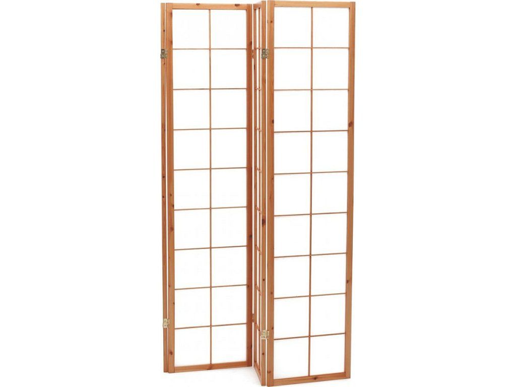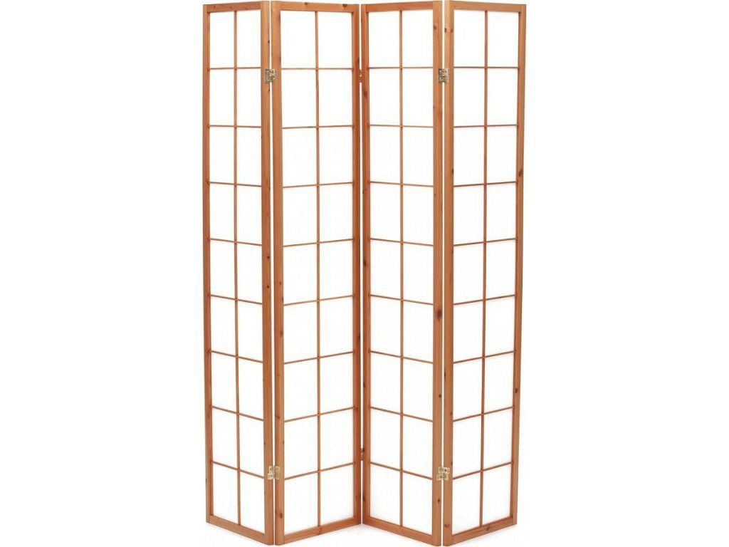 4dílný volně stojící paraván s konstrukcí z masivního smrkového dřeva v přírodní barvě a výplní z bílé netkané textilie. Plní nejen funkci okrasnou, ale také praktickou. Lze jej použít jako zástěnu nebo diskrétní i optickou dělící příčku nejen v bytě, ale i v komerčních prostorách. Díky skládací konstrukci a celkové nízké hmotnosti jej lze bez problémů přemísťovat a manipulovat s ním. Kombinace dřeva a netkané textilie působí vzdušným dojmem, stylově lze paraván umístit do jakkoli zařízeného interiéru. V každém si najde zasloužené místo. Výška paravánu je 178 cm, šíře jednoho dílu 43,5 cm, celková plná šíře je 176 cm. Tloušťka stěny jsou 2 cm. Stěny paravánu jsou k sobě připevněny kovovými pomosazenými panty. Celková hmotnost je 6,5 kg.Doplňkové parametry