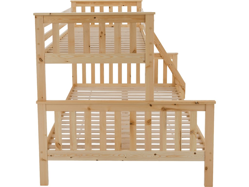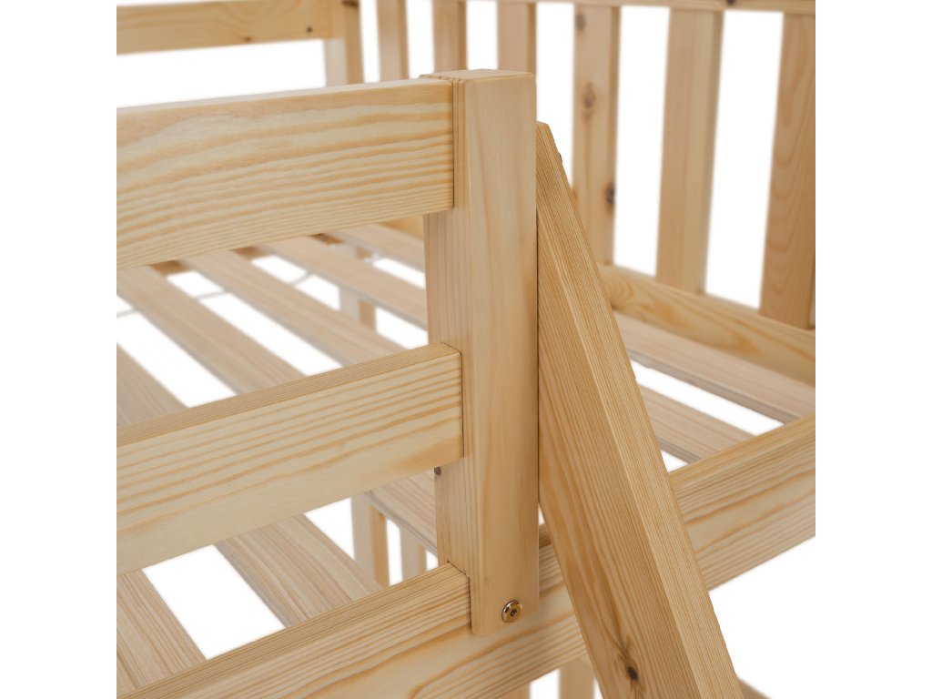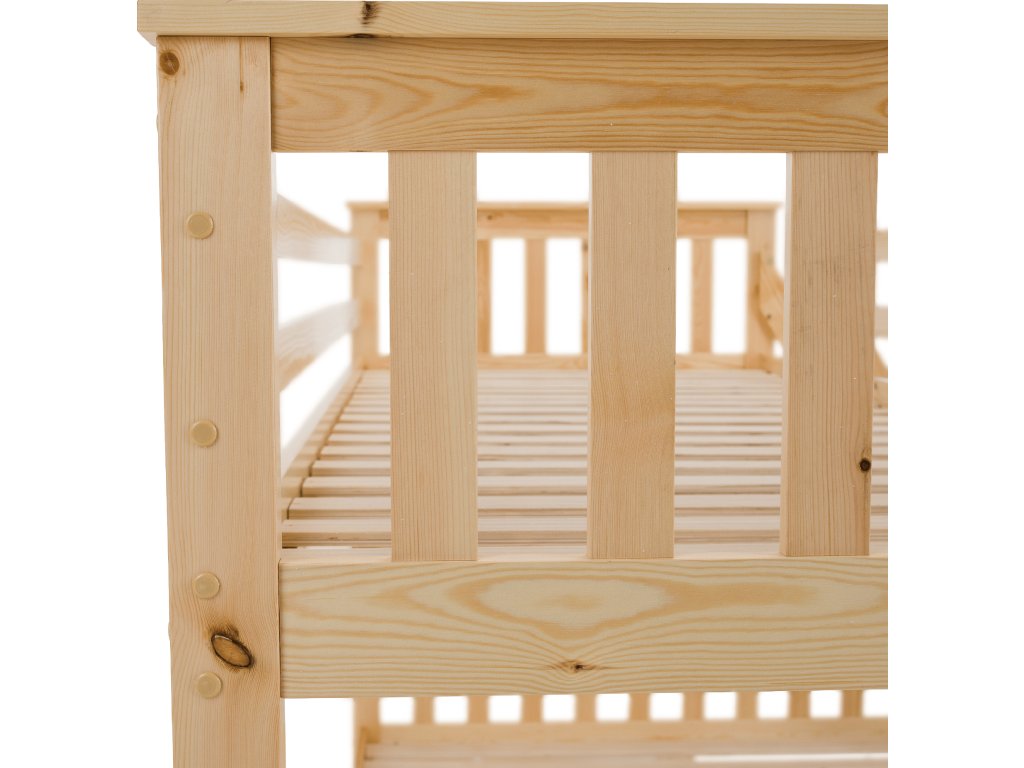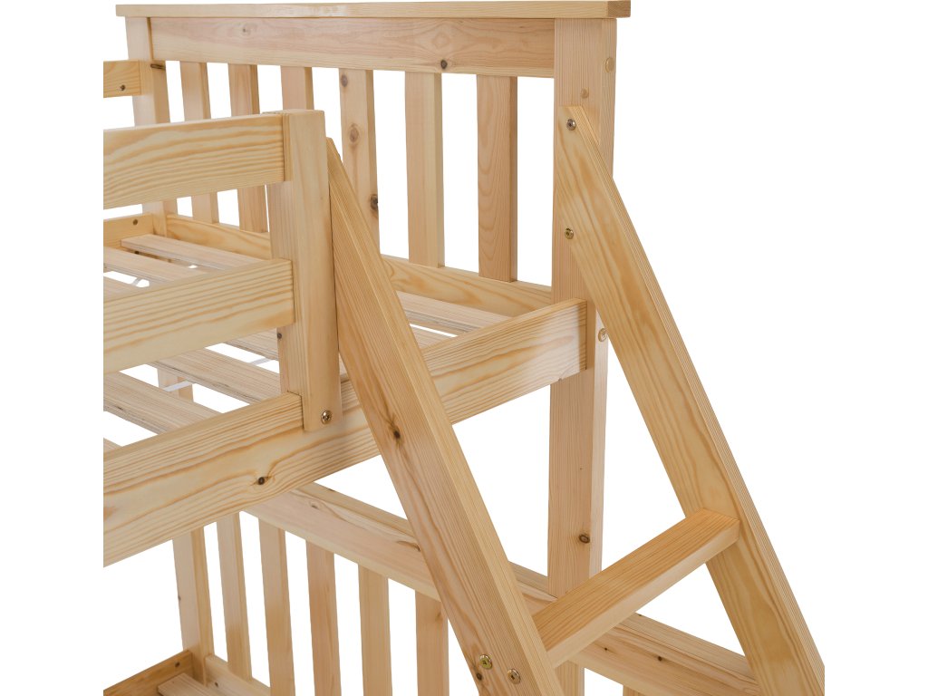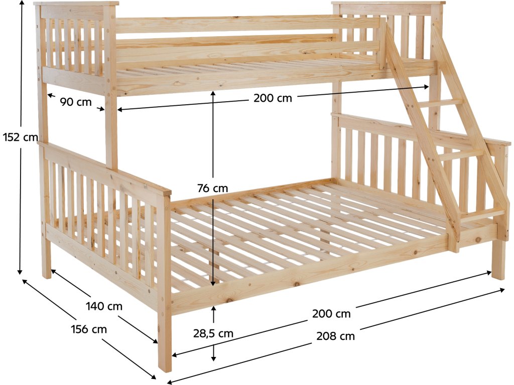 Patrová rozložitelná postel s roštem LUINI Barva: přírodní Materiál: borovicové dřevo / překližka (rošt) Rozměry (ŠxHxV): 208x156x152 cm Plocha na spaní dolní lůžko (ŠxH): 140x200 cm Plocha na spaní horní lůžko (ŠxH): 90x200 cm Nosnost horní lůžko: 80 kg Nosnost spodní lůžko: 100 kg Maximálna výška matraca na horné lôžko: 14 cm Tloušťka materiálu: 20 mm Tloušťka materiálu nohou (ŠxH): 30x70 mm Lůžka mají po rozložení odlišnou výšku Dodávané s roštem. Dodávané bez matrace. Možnost dokoupit matraci s naší nabídky. Dodávané v demontu. Vhodná i pro 3 lidi