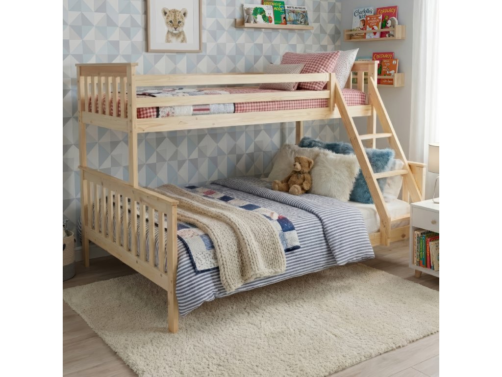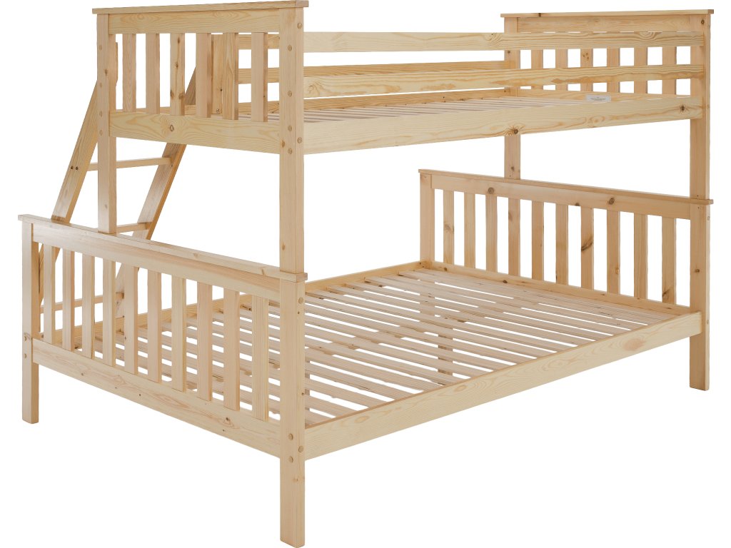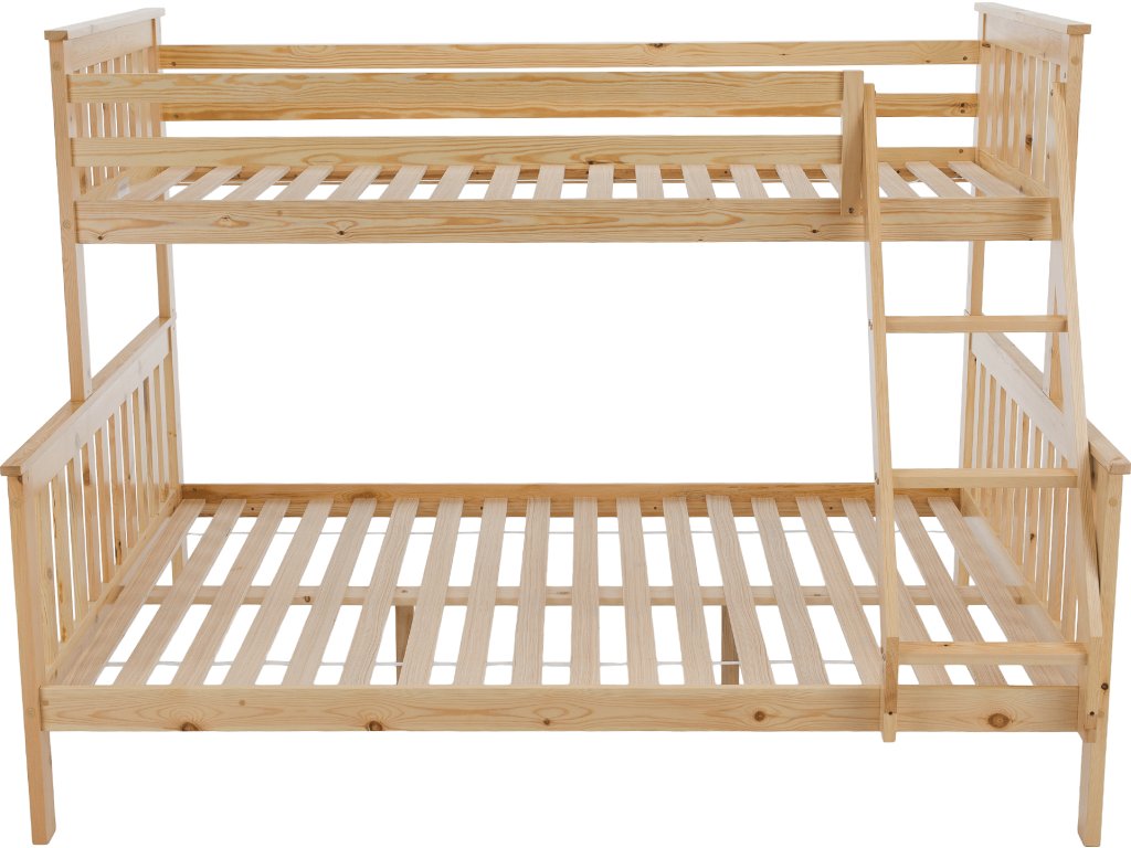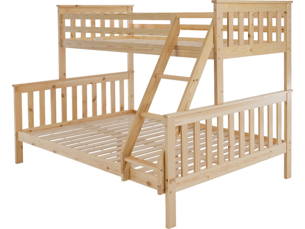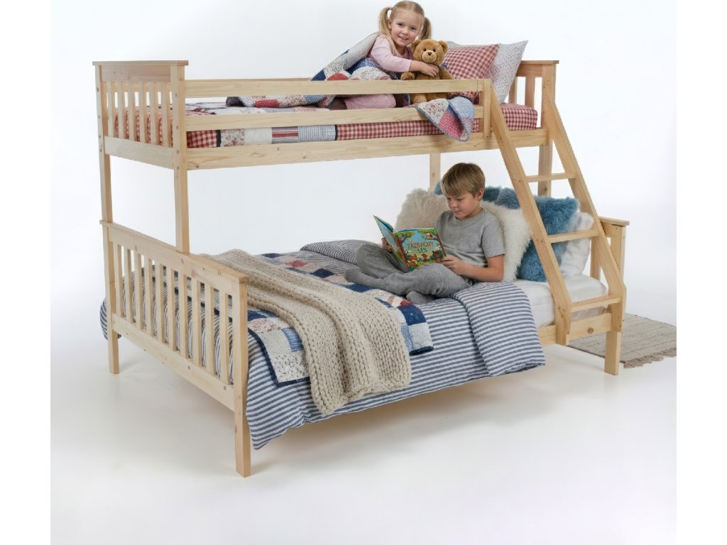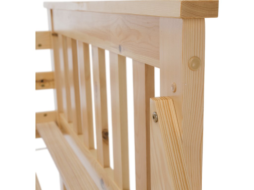 Patrová rozložitelná postel s roštem LUINI Barva: přírodní Materiál: borovicové dřevo / překližka (rošt) Rozměry (ŠxHxV): 208x156x152 cm Plocha na spaní dolní lůžko (ŠxH): 140x200 cm Plocha na spaní horní lůžko (ŠxH): 90x200 cm Nosnost horní lůžko: 80 kg Nosnost spodní lůžko: 100 kg Maximálna výška matraca na horné lôžko: 14 cm Tloušťka materiálu: 20 mm Tloušťka materiálu nohou (ŠxH): 30x70 mm Lůžka mají po rozložení odlišnou výšku Dodávané s roštem. Dodávané bez matrace. Možnost dokoupit matraci s naší nabídky. Dodávané v demontu. Vhodná i pro 3 lidi
