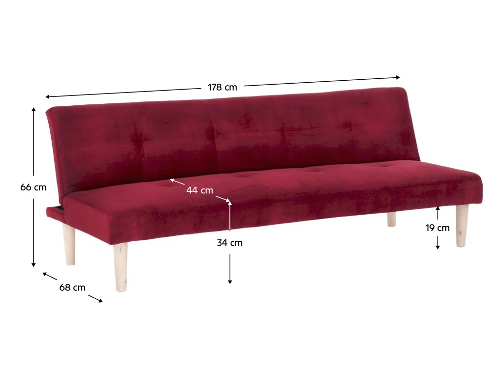 Materiál čalounění: Velvet látka Oděruodolnost textilie podle testu Martindale: 80 000 oděrek Barva čalounění: bordó Materiál nohy: dřevo Barva nohy: dub Rozměry (ŠxHxV): 178x68x66 cm rozkládací Plocha na spaní (ŠxHxV): 178x84x34 cm Výška sedu: 34 cm Hloubka sedu: 44 cm moderní design Molitanová výplň sedáku Dřevěné nožičky Dodávané v demontu