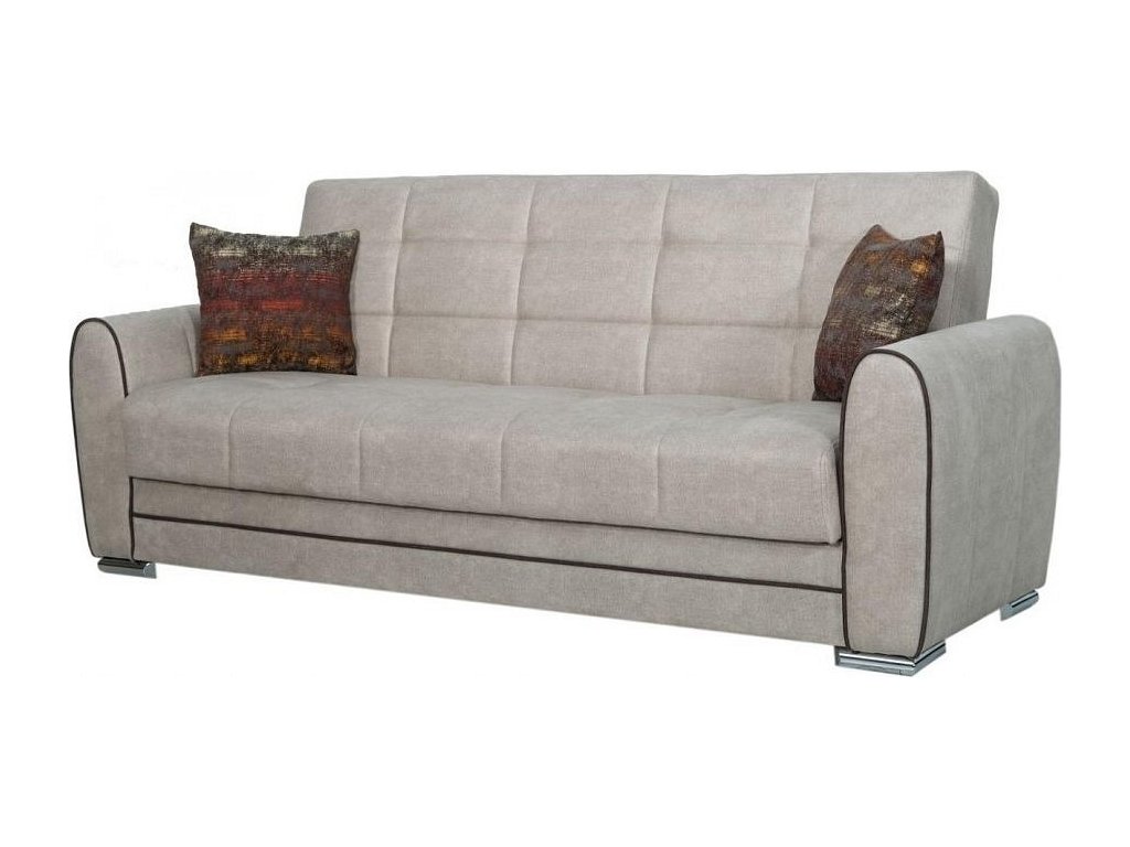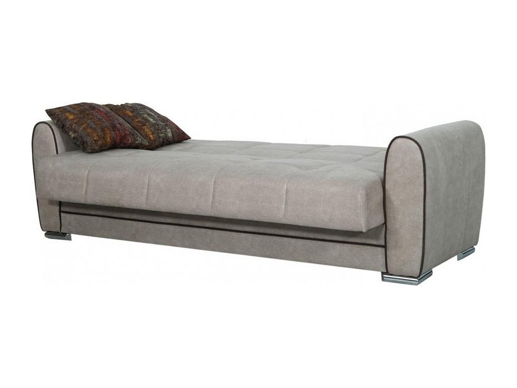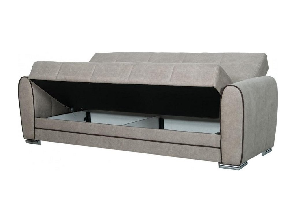 Třímístná pohovka s funkcí spaní a úložným prostorem bude praktickým kouskem do každého interiéru. Pohovka je ideální pro každodenní odpočinek, ale také vhodné místo ke spaní nejen pro Vás, ale i vaše hosty. Za komfort sezení a spaní jsou zodpovědné pružiny Bonnell a vysoce kvalitní PUR pěna. Úložný prostor pod sedákem poskytuje dostatek prostoru pro uskladnění ložního prádla či přikrývek. Pohovka je čalouněna kvalitní potahovou látkou v barvě ecru doplněné hnědým lem a dekoračními polštářky a stojí na chromových nožičkách. Specifikace: spací plocha po rozložení: 115 x 182 cm, celkové rozměry: Š:221/H:83/V:91 cm. K pohovce lze dokoupit i samostatné křeslo.Doplňkové parametry