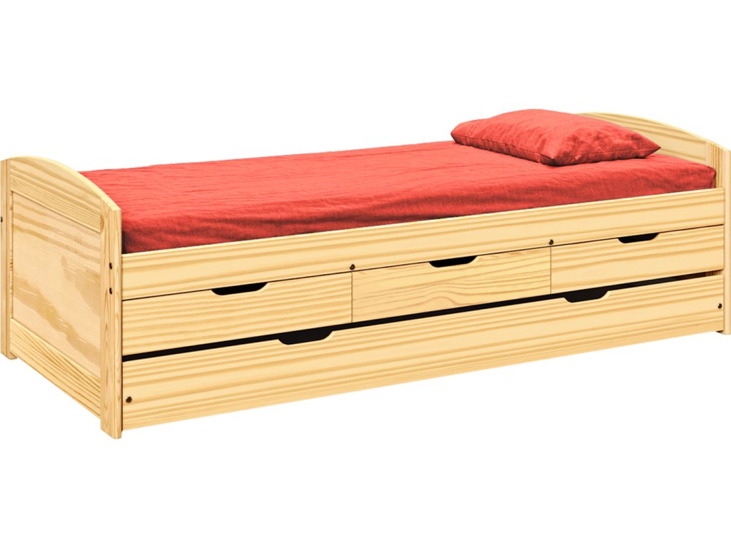 materiál masiv borovice, lakované provedení výška sedu 52 cm, praktické úložné prostory pod postelí (3 zásuvky a výsuv) jsou v ceně cena včetně roštu (dřevěný laťkový) bez matrace, doporučený rozměr matrace 90 × 200 cm doporučená výška matrace pro přistýlku je do 10 cm