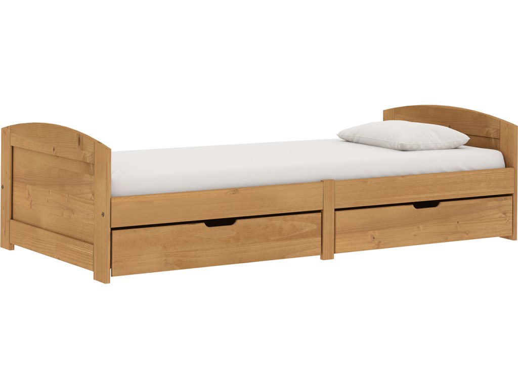 materiál masiv borovice, voskované provedení 2 zásuvky pojízdné na kolečkách jsou v ceně cena včetně roštu (dřevěný laťkový) bez matrace doporučený rozměr matrace 90 × 200 cm