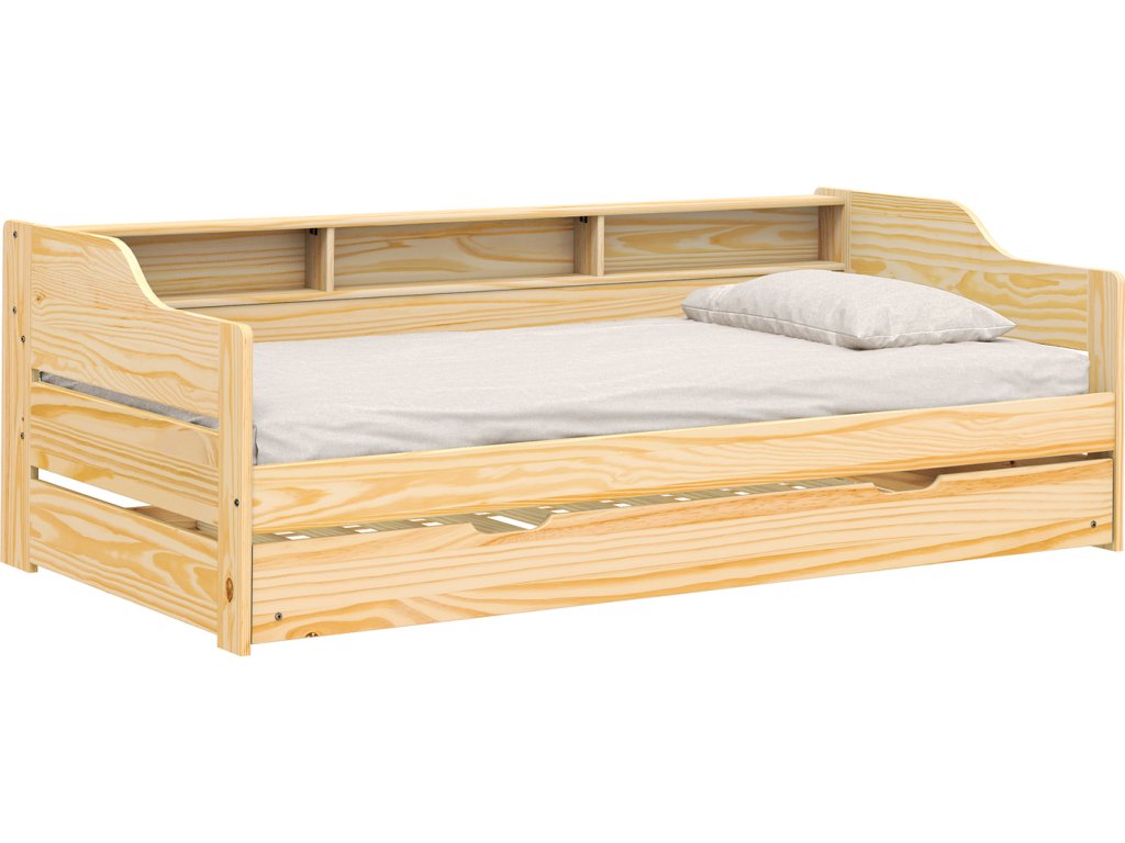 materiál masiv borovice, lakované provedení v zadní části otevřená police, v dolní části výsuvná přistýlka cena včetně roštů (dřevěné laťkové), matrace nejsou v ceně doporučený rozměr matrací 90 × 200 cm