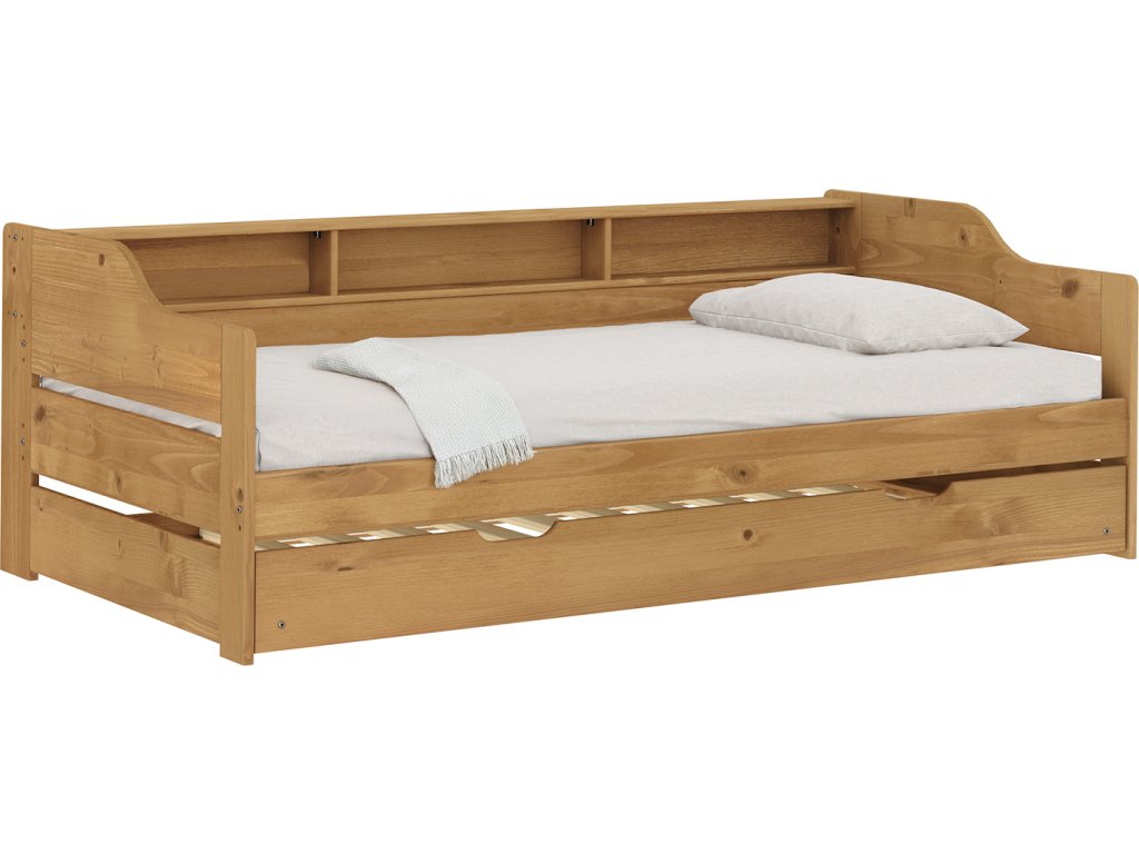 materiál masiv borovice, voskované provedení v zadní části otevřená police, v dolní části výsuvná přistýlka cena včetně roštů (dřevěné laťkové), matrace nejsou v ceně doporučený rozměr matrací 90 × 200 cm