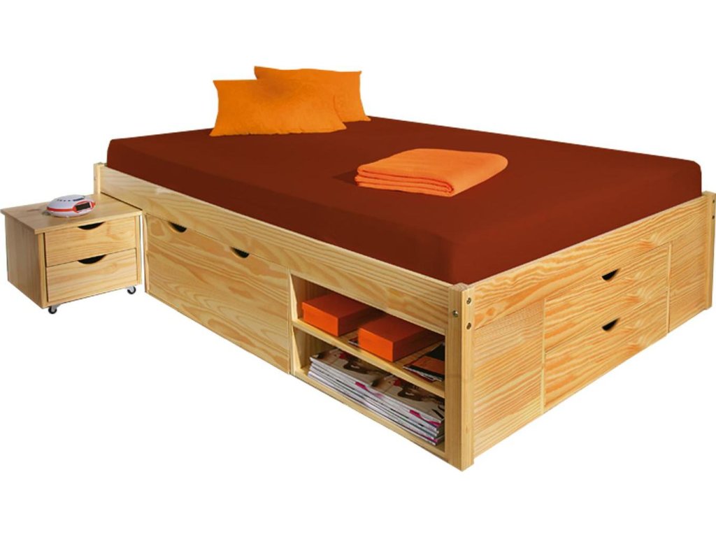 materiál masiv borovice, lakované provedení praktické úložné prostory pod postelí, výška sedu 44,5 cm 2 výsuvné noční stolky a rošt (dřevěný laťkový) jsou v ceně, matrace není v ceně doporučený rozměr matrace 160 × 200 cm nebo 2 kusy 80 × 200 cm