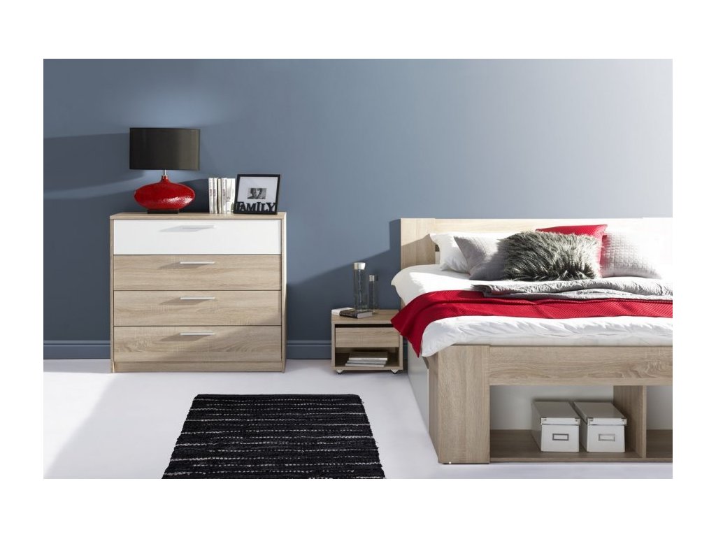 Postel z kolekce MILO v moderním provedení. Korpus i dvířka jsou z kvalitního LTD, barevné provedení - dub sonoma s bílou. Postel obsahuje na každé straně zásuvku pod postel a noční stolek se zásuvkou, který lze zasunout pod postel. V nohách postele je regál. Rozměry ( v./š./h. ) - noční stolek - 30,8 x 40 x 40 cm, zásuvka u nočního stolku - 35,6 x 35 x 15 cm, zásuvka pod postel - 117 x 60 x 18 cm. Postel neobsahuje rošt ani matraci, to je třeba doobjednat, vhodný rozměr 140 x 200 cm. Dodáváme v demontovaném stavu.Doplňkové parametry
