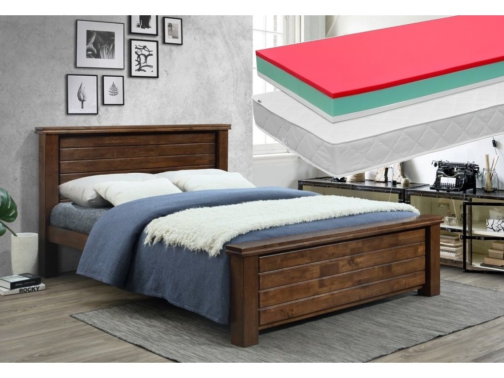 Cenově výhodná nabídka! Jedná se o 2 ks matrace LITERA 90 a k tomu postel BAYERN. Popis matrace - Klasická sendvičová matrace z odolných a vzdušných pěn Flexifoam®. Ortopedická matrace s pevným potahem s lemovkou s označením tužší a měkčí strany. Strana HARD (tužší, červená, tuhost 3,5/5); Strana SOFT (měkčí, bílá, tuhost 3/5). Robustní středová část je vyrobena z prodyšné pěny – odolná, stabilní pěna Flexifoam®. Matrace má pevný nesnímatelný potah s lemovkou, který lze čistit tradičními metodami (viz všivka). Potah je prošitý klimatizační vrstvou dutého vlákna po obou stranách zajišťující pohodlí, vzdušnost a izolaci. Doporučená nosnost do 120 kg. Matrace je vhodná na všechny typy lamelových roštů, lze ji uložit i na laťkový rošt. Matrace jsou 2 kusy o rozměru 90 x 200 cm. Popis postele - moderní postel originálního vzhledu. Konstrukce je ze dřeva v odstínu vlašský ořech. Rošt je v ceně, výška roštu od země je 26 cm. Dodáváme v demontovaném stavu.Doplňkové parametry