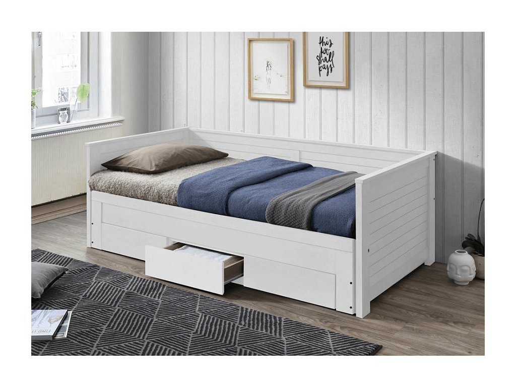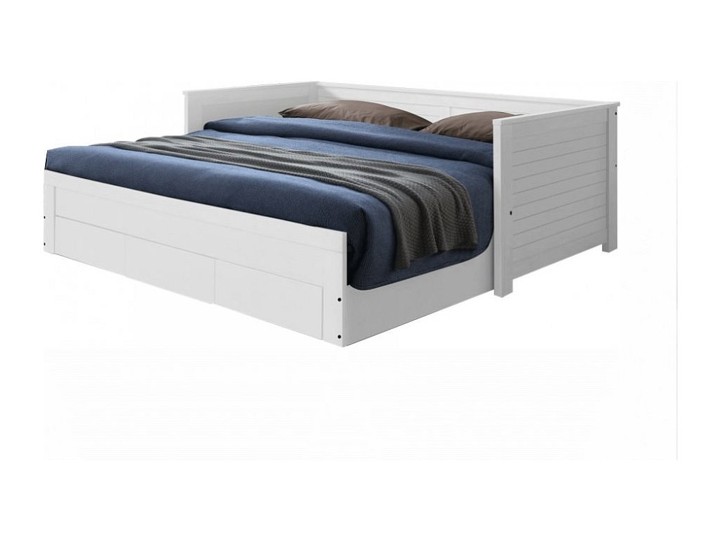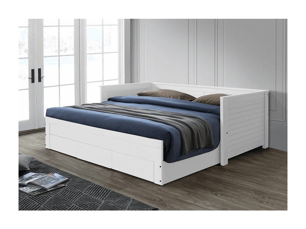 Materiál: masivní dřevo/MDF Barva: bílá Rozměry (ŠxHxV): 209x103x72 cm Rozměry jednolůžka (ŠxHxV): 90x200 cm Rozměry postele po rozložení (ŠxHxV): 180x200 cm Vysouvací konstrukce na kolečkách Dodávané s 2 laťkový rošt Výška po rošt: 36 cm Nosnost: 110 kg S boční zástěnou S 3 šuplíky Dodávané bez matrace Možnost zakoupit matrace z naší nabídky Dodávané v demontu Pokud plánujete postel používat rozloženou jako manželskou postel, doporučujeme matrace s rozměry 90x200 z naší nabídky. Pokud postel budete používat jako jednolůžko, doporučujeme matrace s rozměrem 85x200 a 95x200 cm. Jedním z matrací ke posteli Goreta může být i matrace BE KATARINA 10 NEW s rozměrem 95x200 cm.