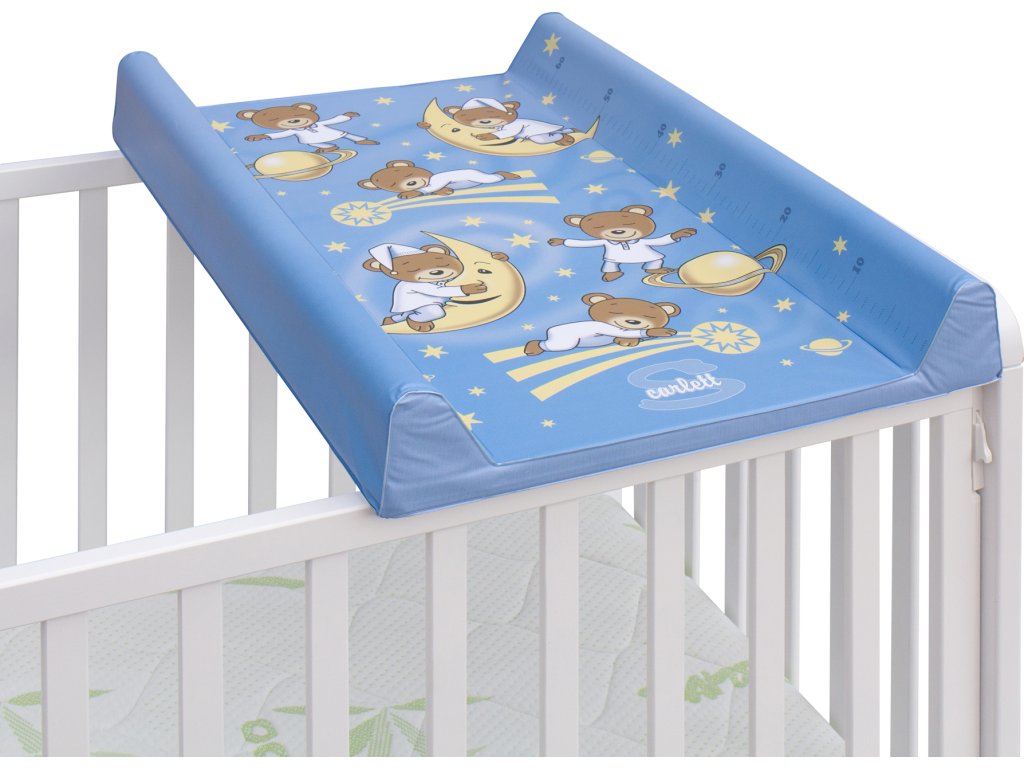 Přebalovací podložka s pevnou vložkou z MDF a profilovanými okraji s kvalitním PVC potahem bez ftalátů, vyplněná molitanem.