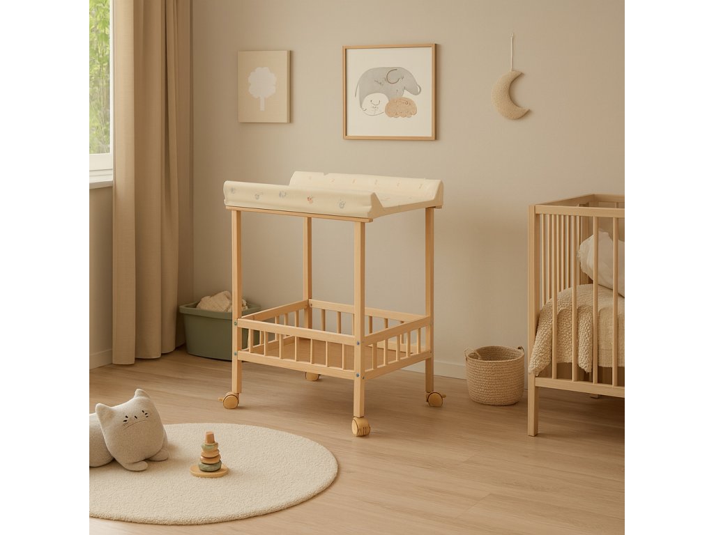 Praktický přebalovací pult se dvěmi policemi z HDF desky. Vrchní přebalovací pult z polyuretanu potažený omyvatelným PVC, vyztužený MDF deskou.