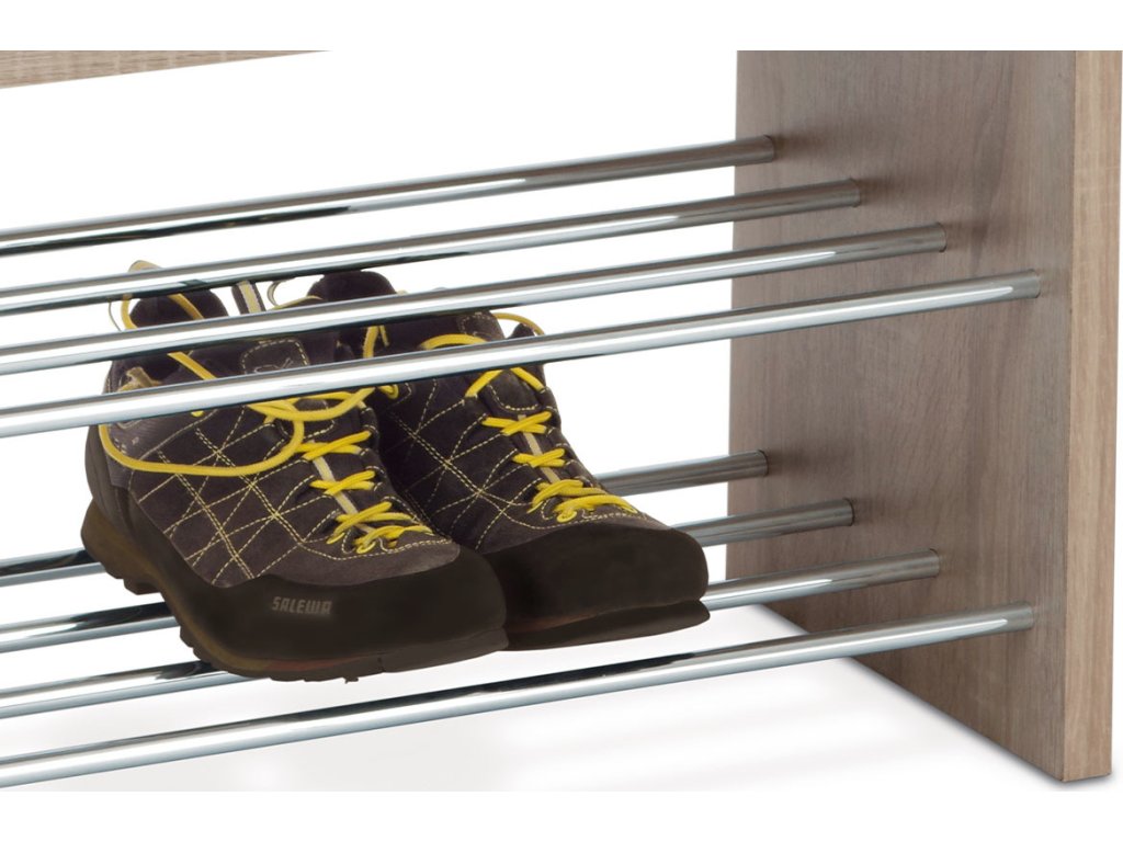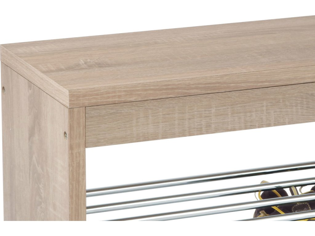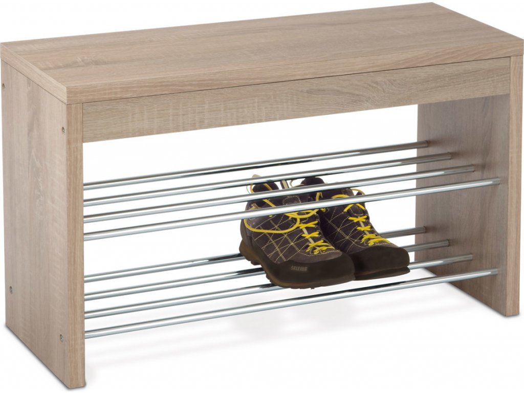 Praktický botník s dvěma kovovými rošty, který zároveň slouží i jako sedací lavice. Díky svým rozměrům má ideální ložnou plochu na uložení bot, ale prostorově se vejde i do menších předsíní. Kostra botníku je z MDF v 3D dekoru dub sonoma. Rošty jsou z kovových chromovaných trubek o průměru 12 mm. Nosnost na sezení je 90 kg, nosnost jednotlivých polic je 6 kg. Dodáváno v demontu. S tímto botníkem bude přezouvání vždy pohodlné a bezpečné.Doplňkové parametry