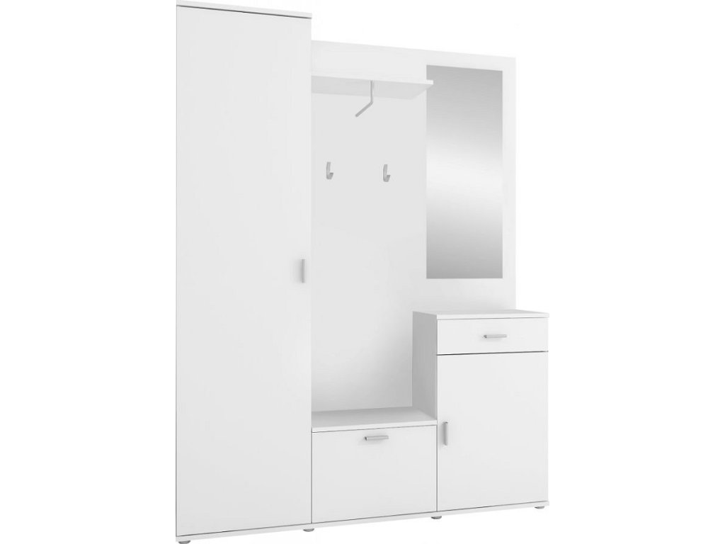 Předsíňová sestava AMALIA Materiál: DTD laminovaná Barva: bílá Rozměry (ŠxHxV): 144x29x188 cm Tloušťka materiálu korpus: 16 mm Dodávané v demontu.