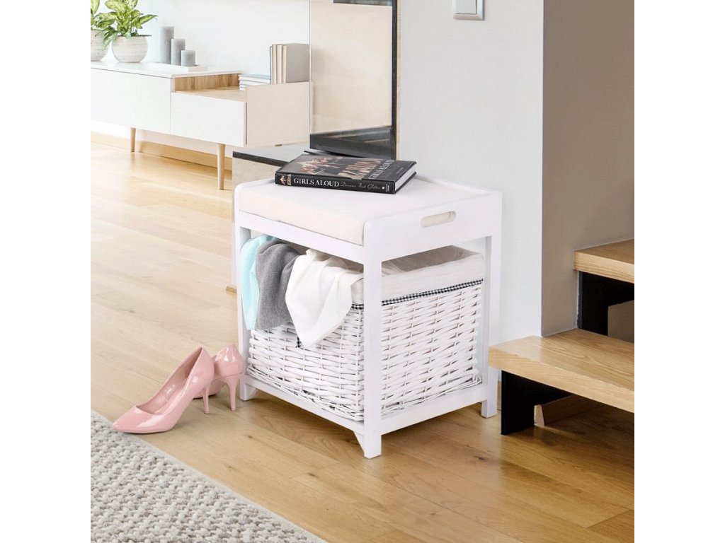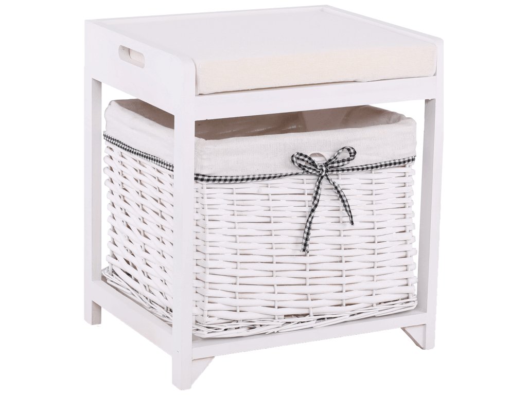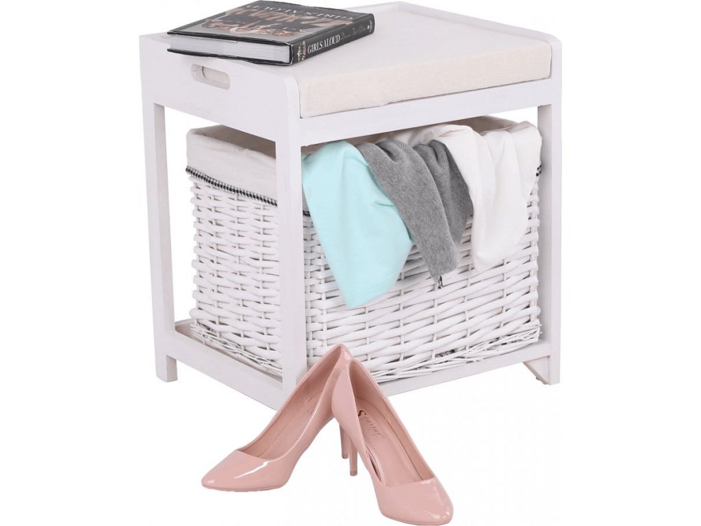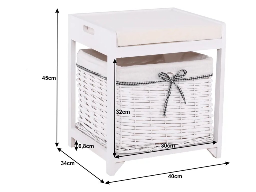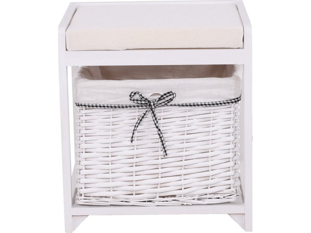 Praktická lavice s proutěným košíkem a polštářem na vrchu Materiál dřevo / proutí, barevné provedení: starobílá Rozměry (ŠxVxH) 40x45x34 cm.