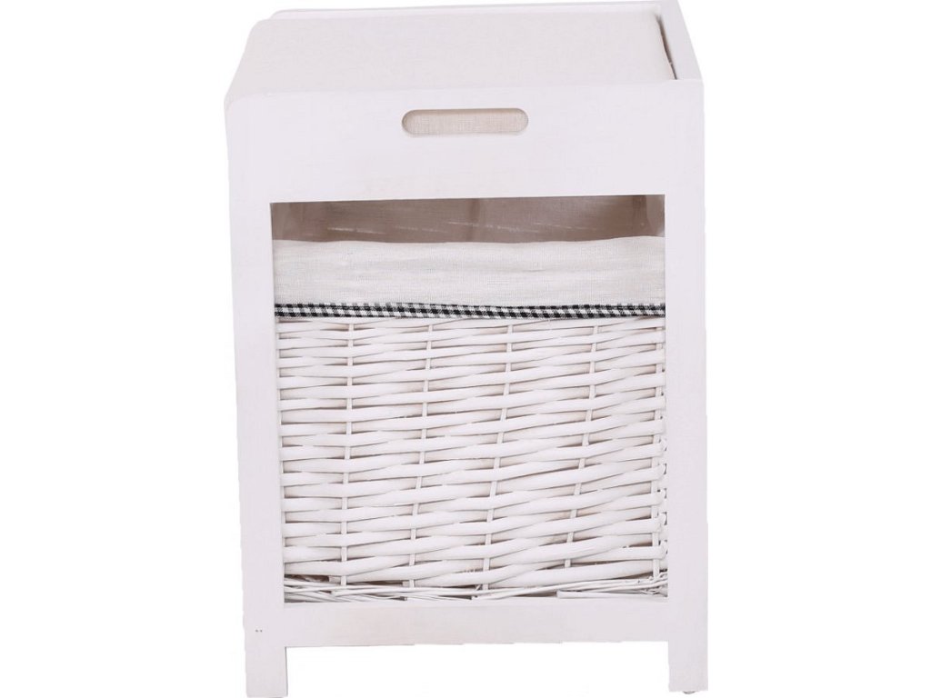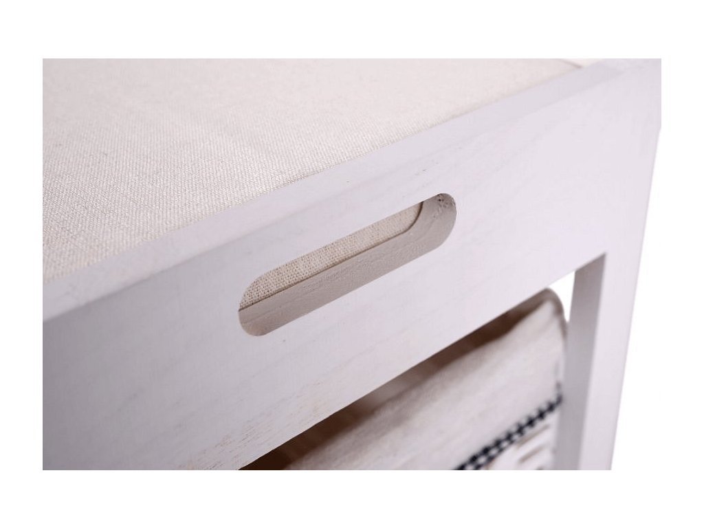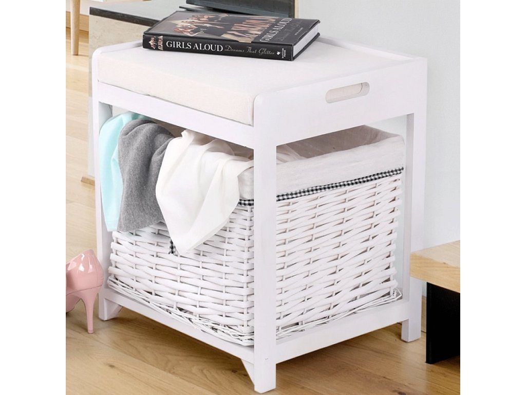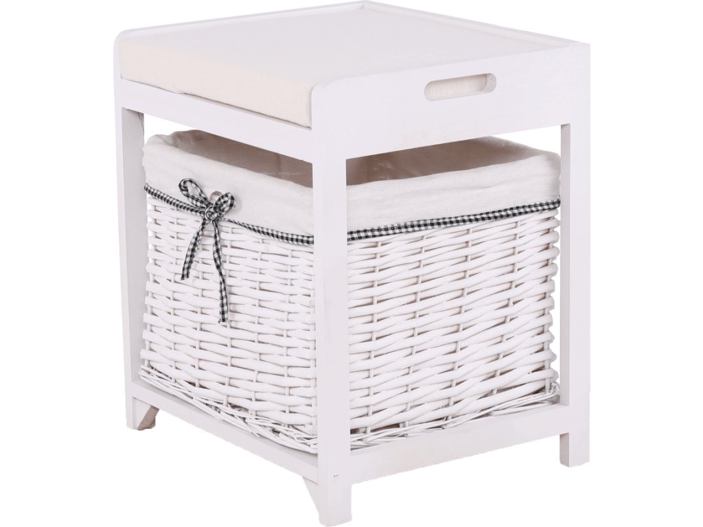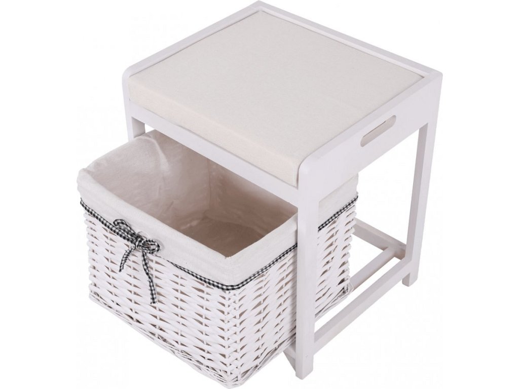 Praktická lavice s proutěným košíkem a polštářem na vrchu Materiál dřevo / proutí, barevné provedení: starobílá Rozměry (ŠxVxH) 40x45x34 cm.