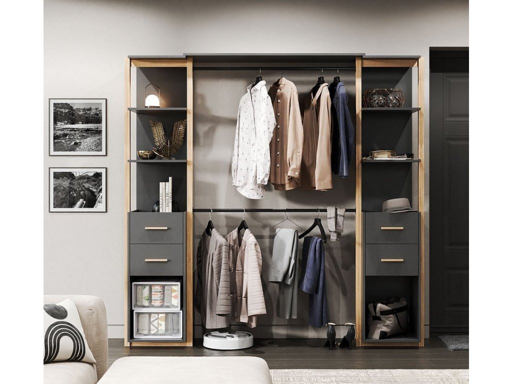 Šatna nabízí dostatek úložného prostoru díky 4 prostorným zásuvkám, otevřeným policím a 2 šatním tyčím, které umožňují přehledné uspořádání oblečení, kabátů či doplňků. Jeho otevřená konstrukce usnadňuje přístup a dodává interiéru vzdušný, elegantní vzhled.