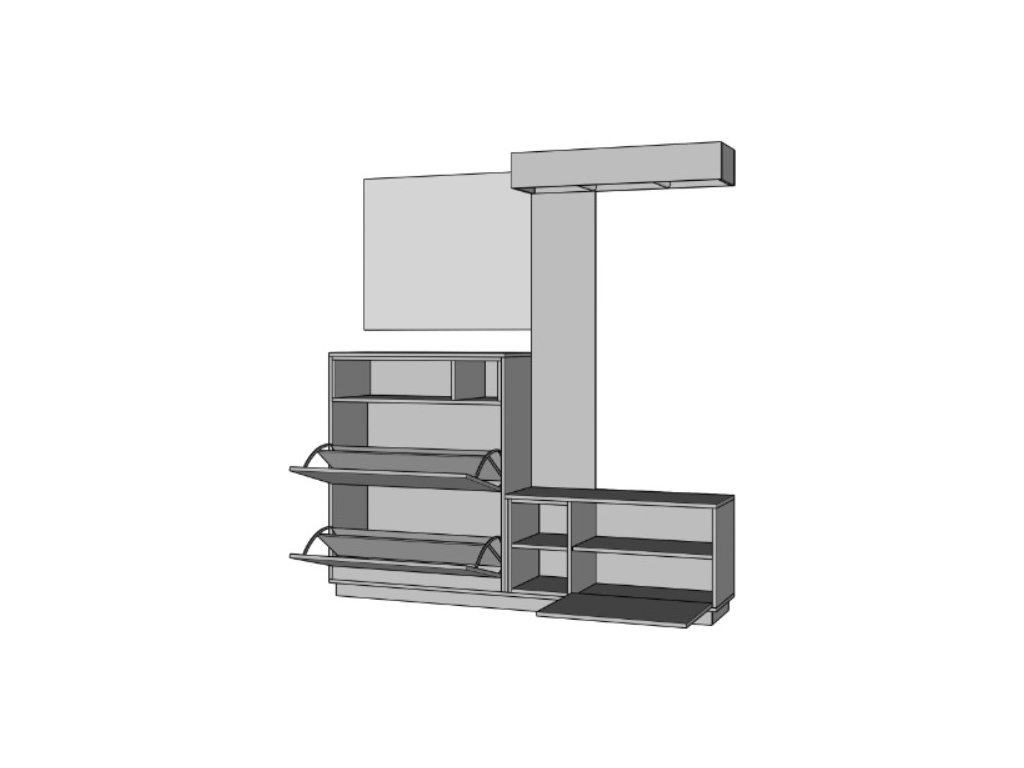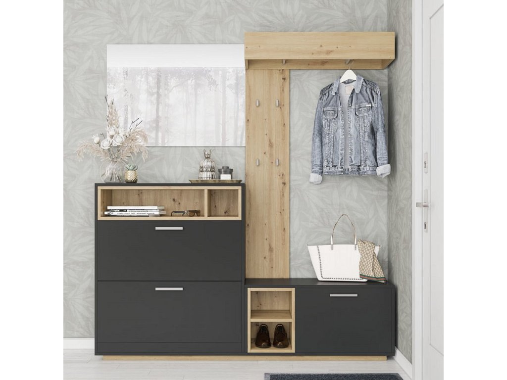 O stylový design Vaší vstupní části se postará moderní předsíňová sestava . Kombinace moderních barev jako dub Artisan v kombinaci s barvou antracit jí dodává jedinečný charakter. Za praktický rozměr sestavy jsou zodpovědné úložné prostory v podobě výklopných skříněk na boty. Snadný přístup ke kabátům zajišťuje věšáková tyč, která je připevněna k hornímu dílu předsíně.