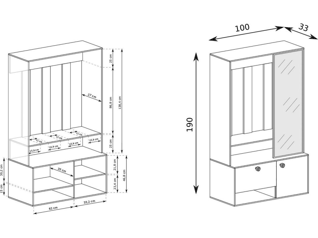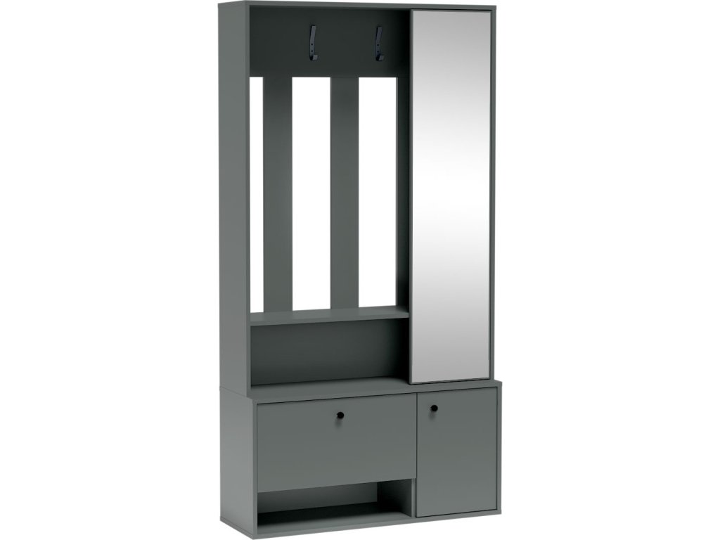 Moderní předsíňová stěna, vyrobená z kvalitní laminátové desky 16 mm v barvě green stone (šedá s nádechem zelené). Zadní strana předsíně je tvořena z lamel. Sestava se skládá z věšákového panelu, 2 botníků, skříně se zrcadlem a volným prostorem. Rozměry viz obrázek. Předsíň je univerzální, dá se složit na obě strany. Dodáváme v demontovaném stavu.